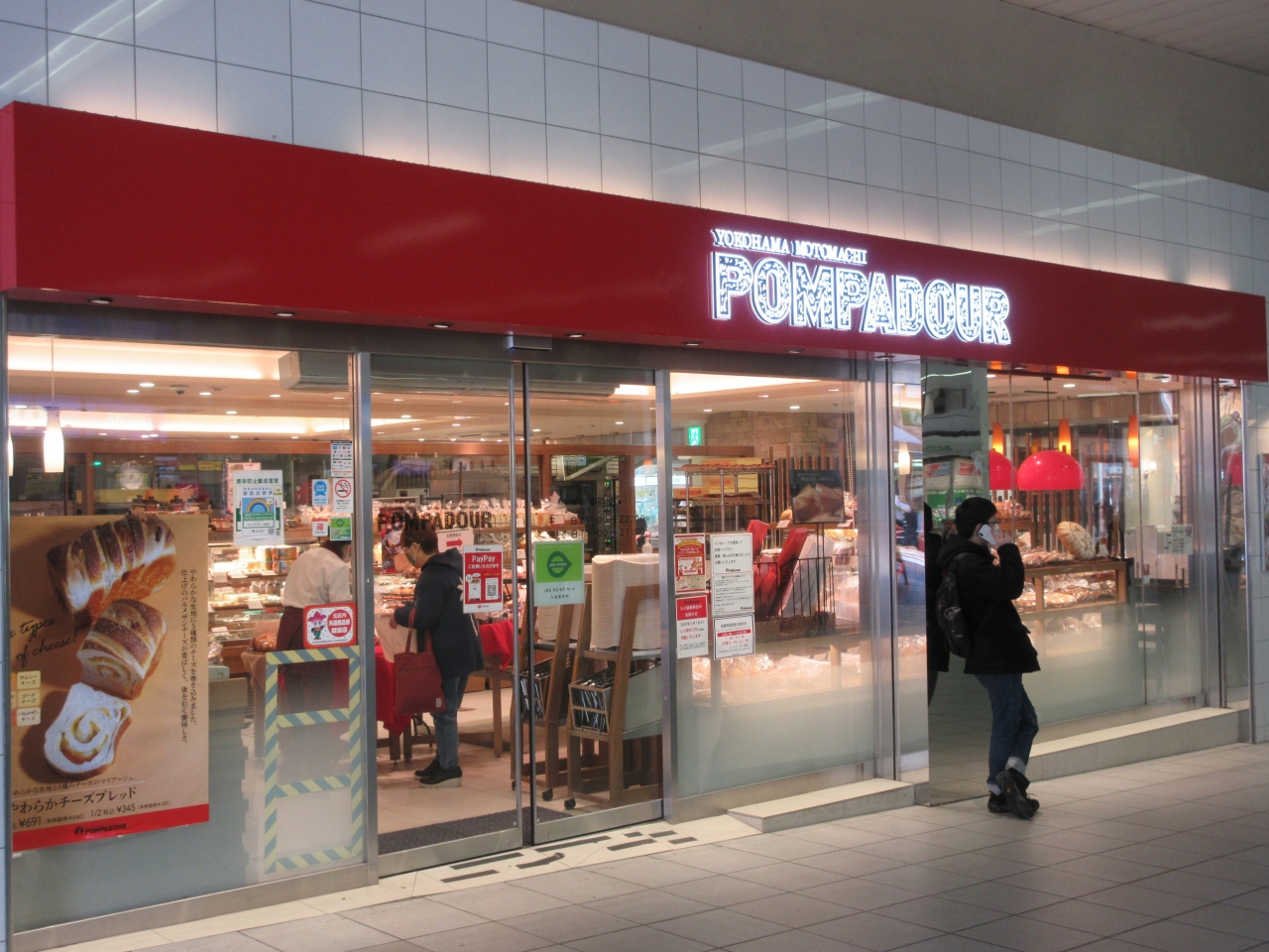 赤羽駅北口改札の前にあります。ビーンズ赤羽の入口脇の目立つ場所です。自宅近くのポンパドウルは馴染みの店で、今回赤羽で初めて利用しましたが、パンの種類は同じで買いやすかったです。イートインカウンターがあるのが特徴で、7時に開店するので出かける前に朝食で利用することができます。