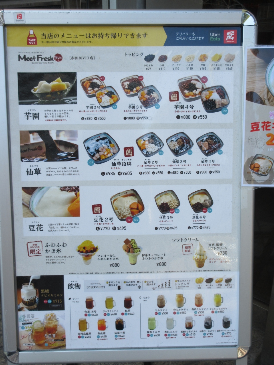 赤羽駅前のビビオ1階、イトーヨーカドー向かいにあります。台湾スイーツ専門店です。かき氷、芋園、仙草、豆花などのスイーツやタピオカドリンクなどがあります。店内に6テーブルと店頭の広場にテーブルがあります。豆花好きの妻は豆花4号(タロイモと小豆)をホットでテイクアウト注文しました。柔らかく煮た小豆とタロイモと豆花が入っていました。さっぱりした甘さのスープと一緒に食べます。Mサイズでも豆花の量が多くて小腹が満たされました。暑くなったらかき氷を食べたいです。