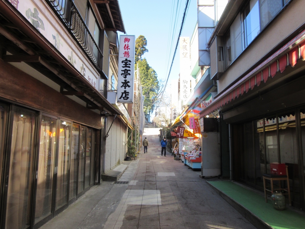 結構な登りなので大変ではありますが、途中に昔ながらの参道の商店街が軒を連ねる所があります。崖側の店は景色も良さそうです。商店街を抜けると本格的な参道となります。1段目が何処かは定かはありませんが、この階段は約330段あるとの事。