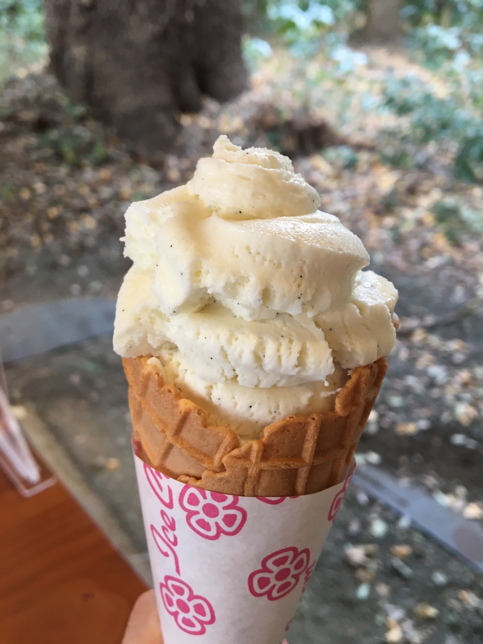 原宿駅から表参道に向かう途中で、明治神宮に立ち寄った際に、こちらのカフェに入りました。木造の内装が明治神宮の自然と調和していて落ち着く雰囲気です。モンブランなどケーキも充実していました。バニラビーンズがたっぷり入ったジェラート(400円)を食べました。