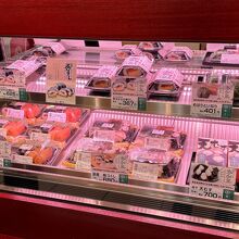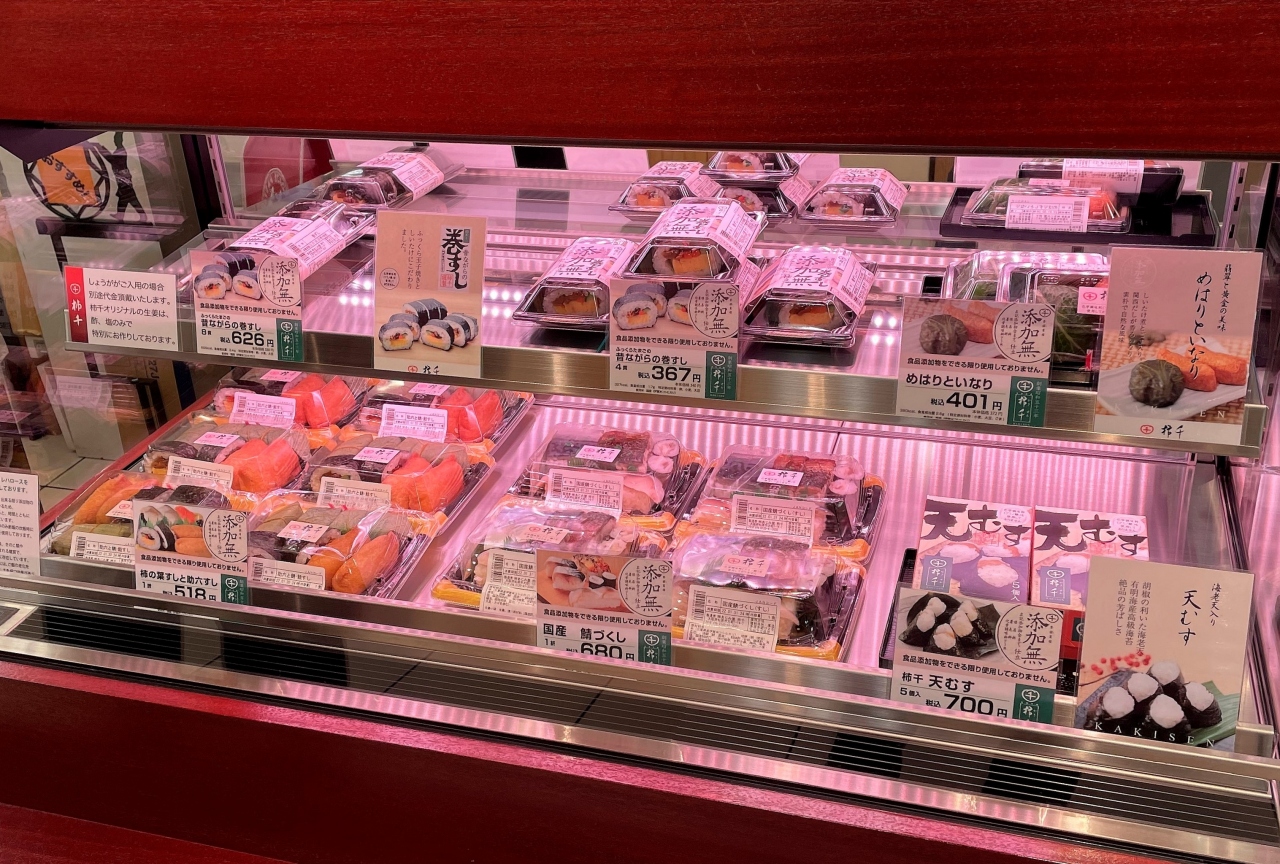 柿千さんはお寿司専門店、ショーケースには柿の葉寿司や鯖寿司など色んなお寿司が並びます。