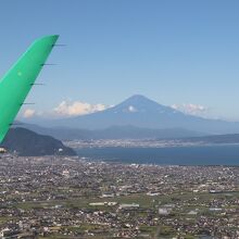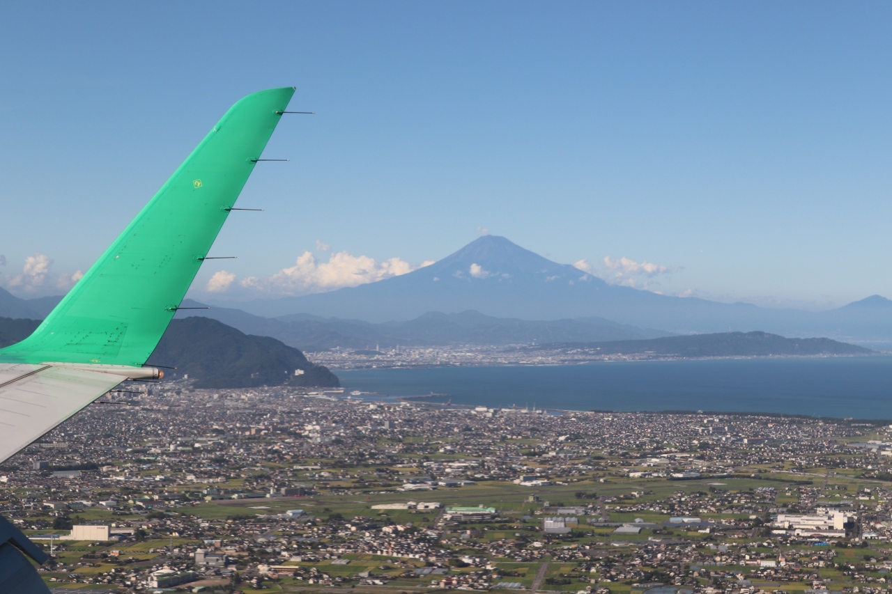 富士ドリームエアライン便で出雲空港から静岡に降り立つ直前、機窓から静岡平野、駿河湾越しにきれいな富士山を眺めることができました。着陸しても、滑走路からちょっと眺めることもできました。静岡空港は正式名称が「富士山静岡空港」でした。