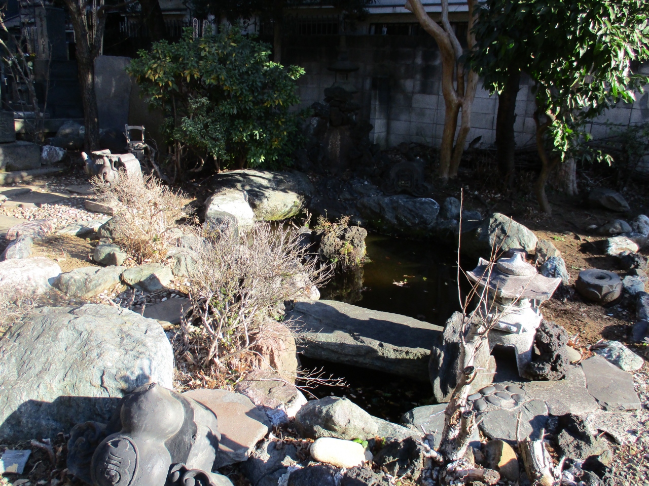 谷中1丁目付近を散策していた時に、お寺があったのでお参りに立ち寄りました。門から中に入ると、かなり広い敷地が広がっていました。境内の片隅には鬼瓦も置かれていて、小さな池もありましたが、全体的な雰囲気は殺風景な感じのするお寺でした。