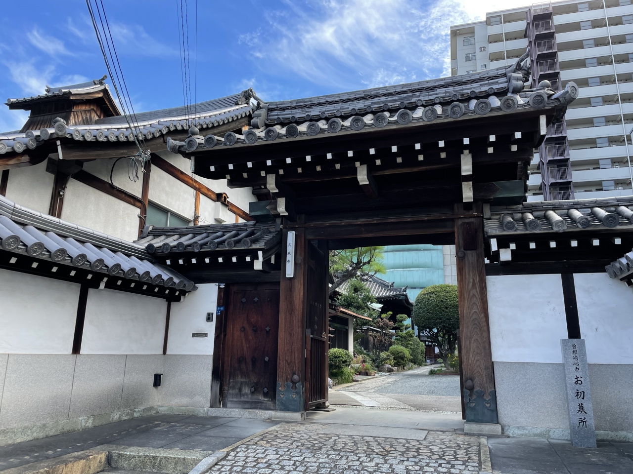 大阪・谷町のお寺が密集しているエリアにある、本門日蓮宗の寺院です。お寺の外観や建物はごく一般的でそれ程特徴はありませんが、近松門左衛門の代表作「曽根崎心中」のモデルとなったお初の墓所があります。山門の傍らに石碑が立っています。