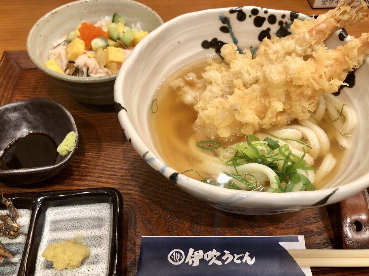香川セット(海老天うどん)と、ミニちらし寿司が付いたセットです。麺もつゆも、なかなか美味しい。ちょっと太麺で柔らかい感じ。僕は好きな固さです。