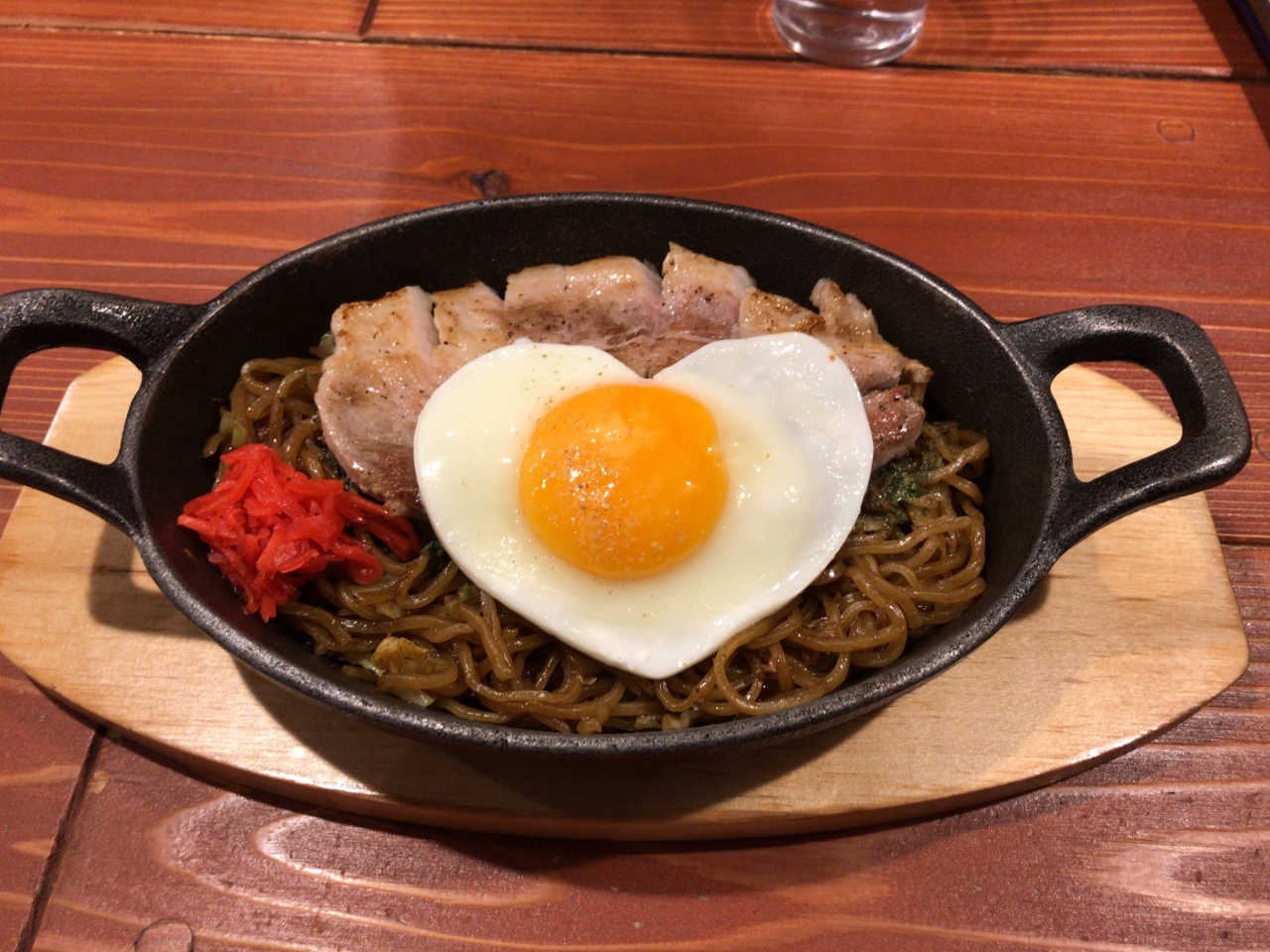 我々の目的も富士宮焼きそば。このお店では豚肉を乗せるのがトレンドのようで、もちっとした食感がクセになる焼きそばと一緒に美味しくいただきました。ハート型の目玉焼きは必見です!
