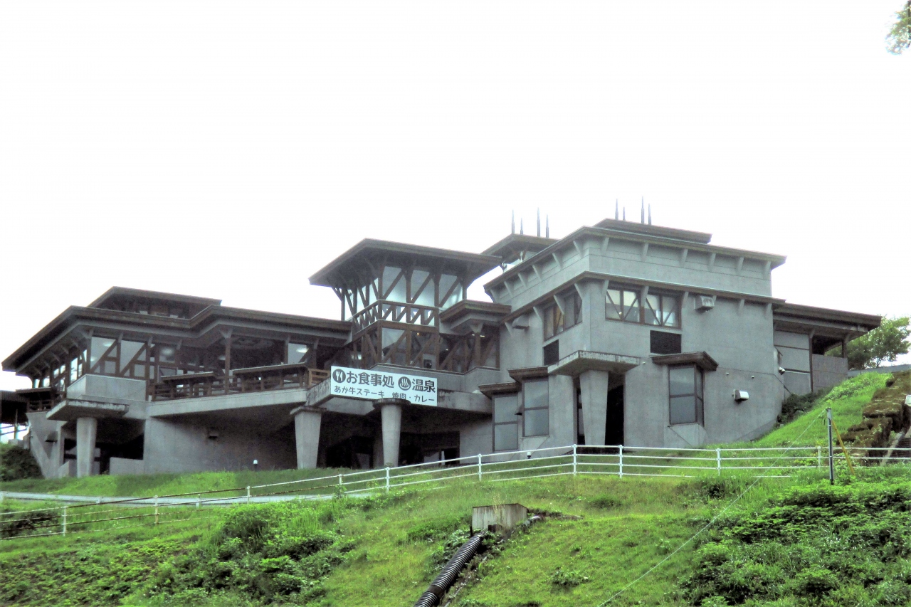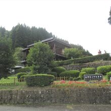 ここは柴三郎が小国に寄付した北里文庫と、本人が帰省した時に泊まるために建てた家(名称はなぜか貴賓館)がある場所です。その北里柴三郎記念館の入口で左の丘上を見ると、特徴的なデザインの建物が見えます。これは、小国町が取り進めている「学びやの里」の建物の一部です。北里柴三郎博士が実践した「学習と交流」を、北里研究所・北里大学の協力を得て、具体化している施設です。その活動の中で、北里柴三郎記念館の寄贈を受け、運営もしているものです。