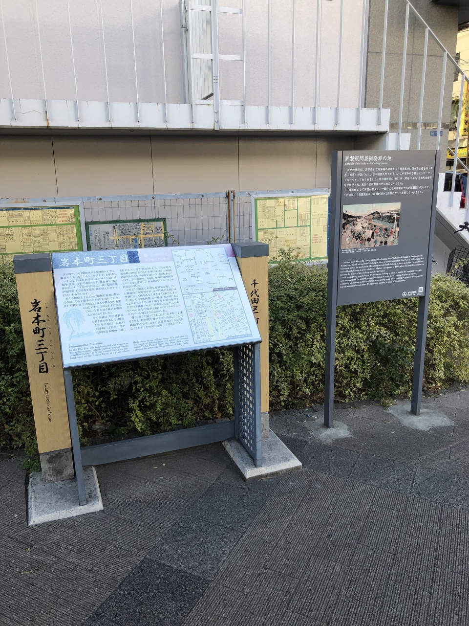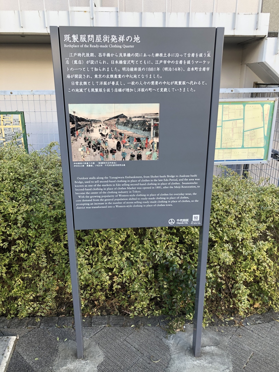 秋葉原駅から昭和通りを神田川方面に進み、川を越えてすぐの所に「既製服問屋街発祥の地」の碑がありました。当時の様子を描いた絵も掲示されているので、賑わいぶりがよくわかりました。また、周囲を歩くと、近くには今も繊維関係のお店があって、その名残が感じられました。