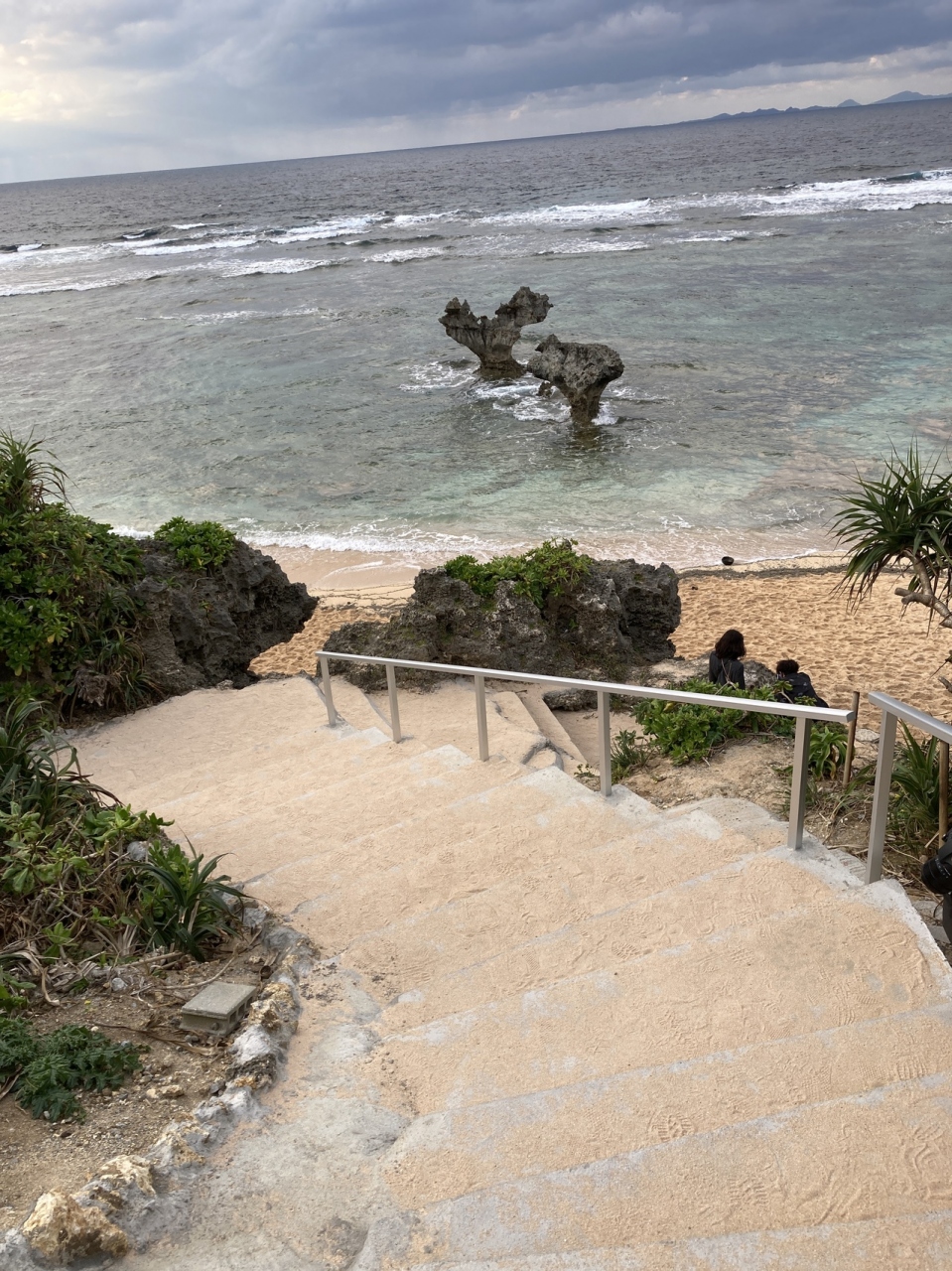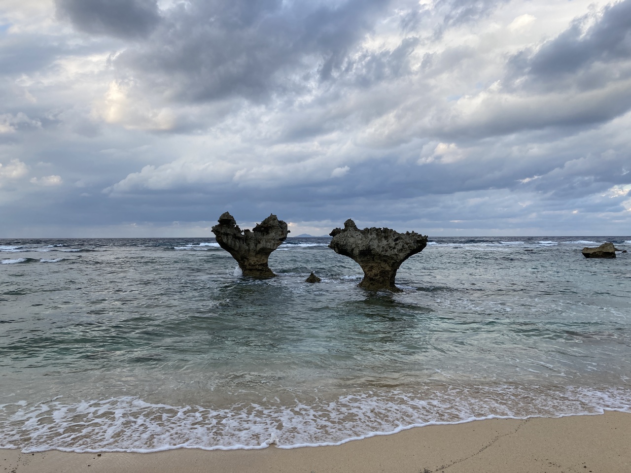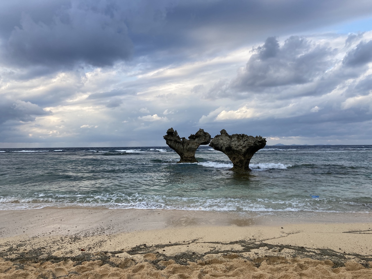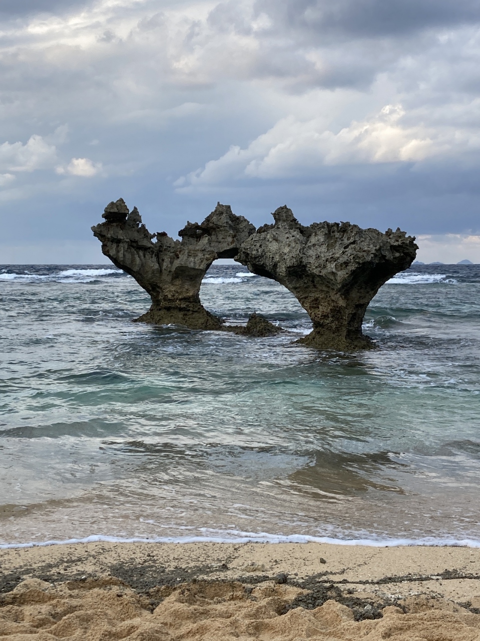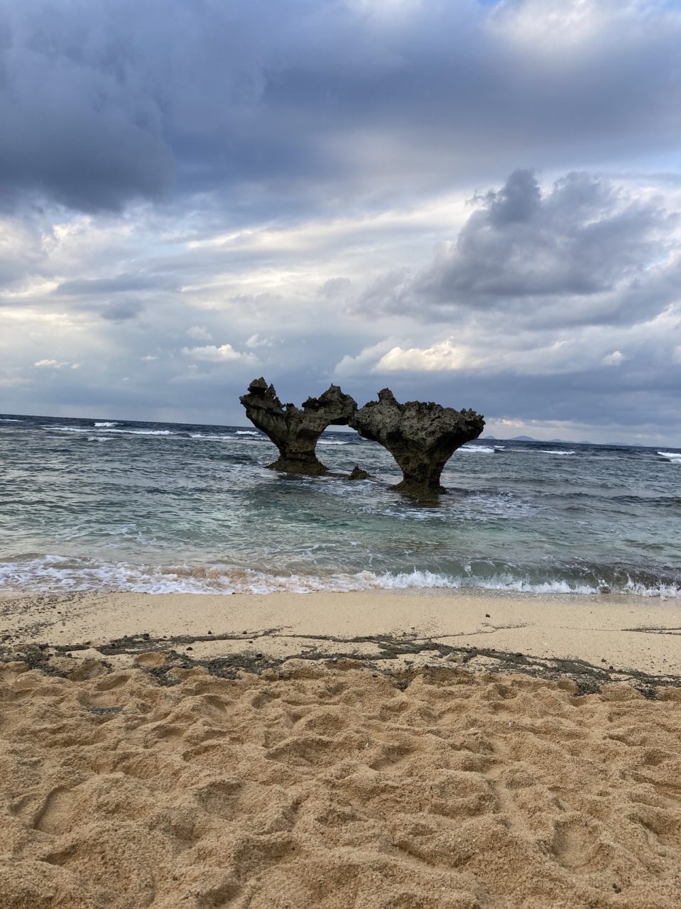 本来なら美しい白いビーチに結構荒々しく立つ二つの岩って感じでしようが、今年は海底火山噴火で流れた軽石が、、しかも非常に歩きづらい浜なんですよ。時間帯または季節のせいか不明ですが柔らかくて深く足首近くまで砂に足を取られます。あんなビーチは初体験。そんな大変な思いをして撮った写真はハートシェープには程遠いのですが、すごく思い出に残っています。