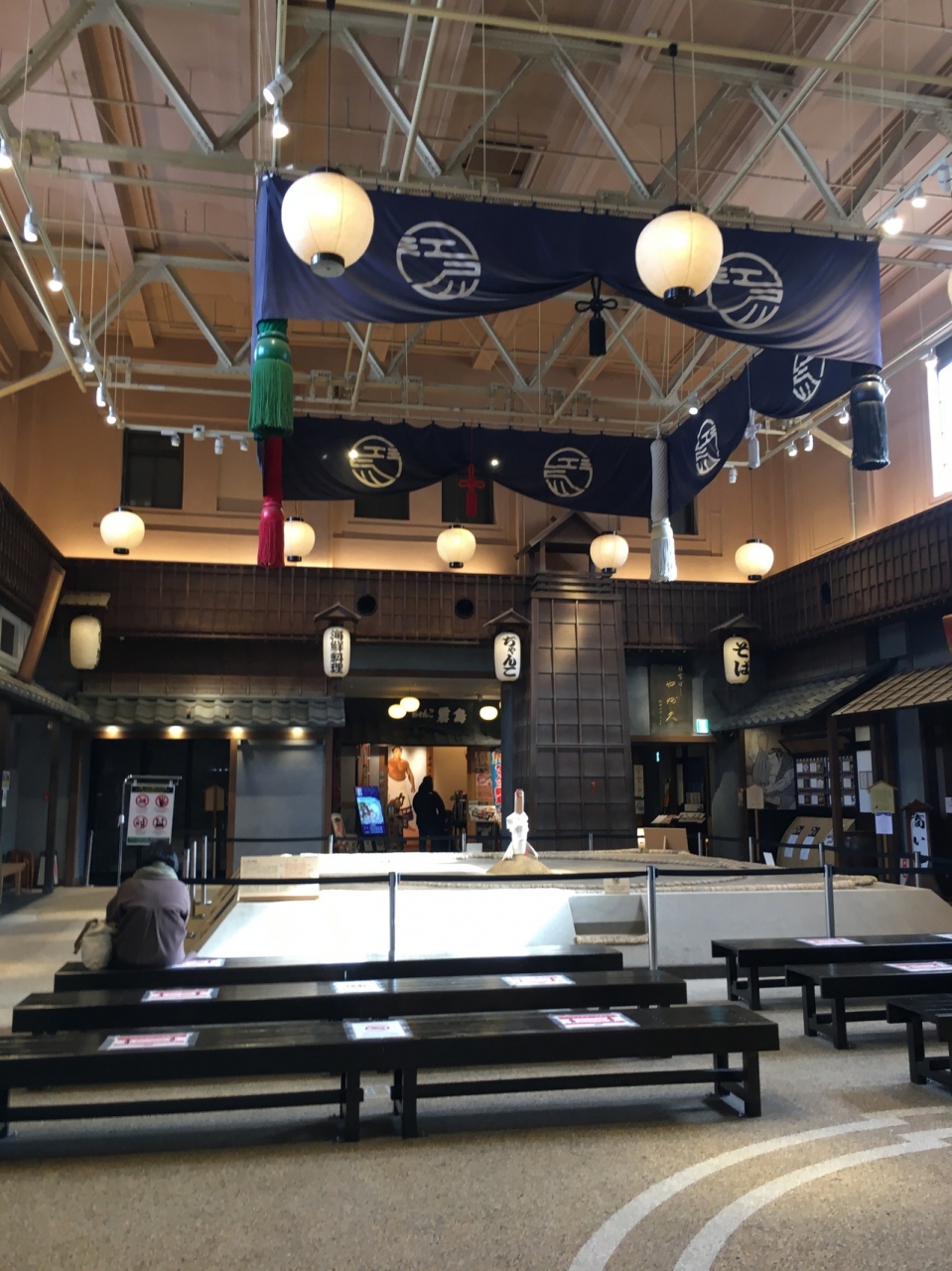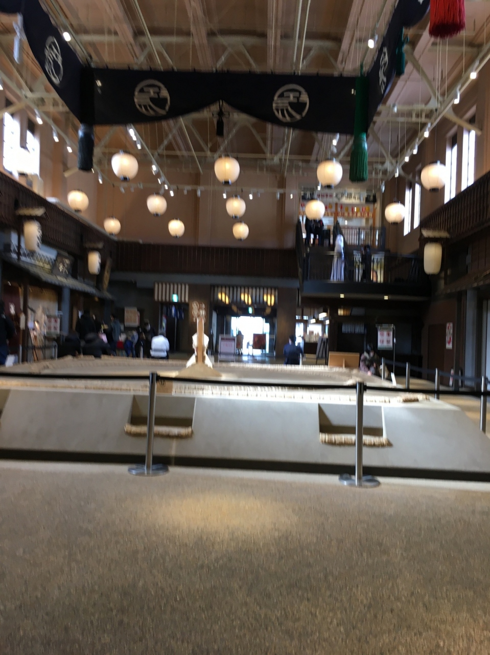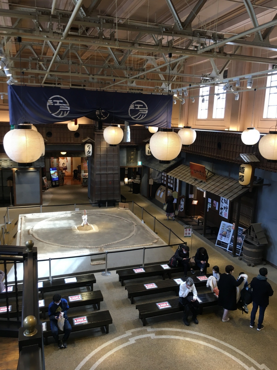 JR両国駅に隣接した2階建ての建物で、観光協会もあり周辺の地図等も置いてありました。奥へ進むと原寸の土俵があって目を引くものがあり、土俵を囲むようにして飲食店がありました。2階の階段からの土俵の眺めが良いです。