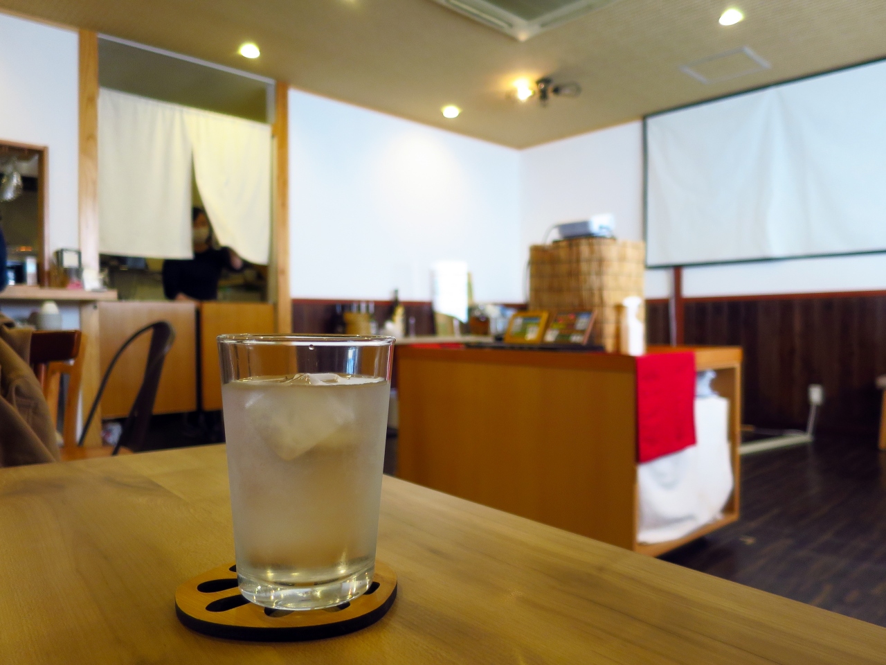 このカフェは、特に夜間において貸切になることがあります。段差のあるスペースの奥の方にプロジェクターとスクリーンがあり、イベント用の映像投影用に使用されると思われます(通常時は使用されていません)。夜間の来店は事前に調べておくといいでしょう。