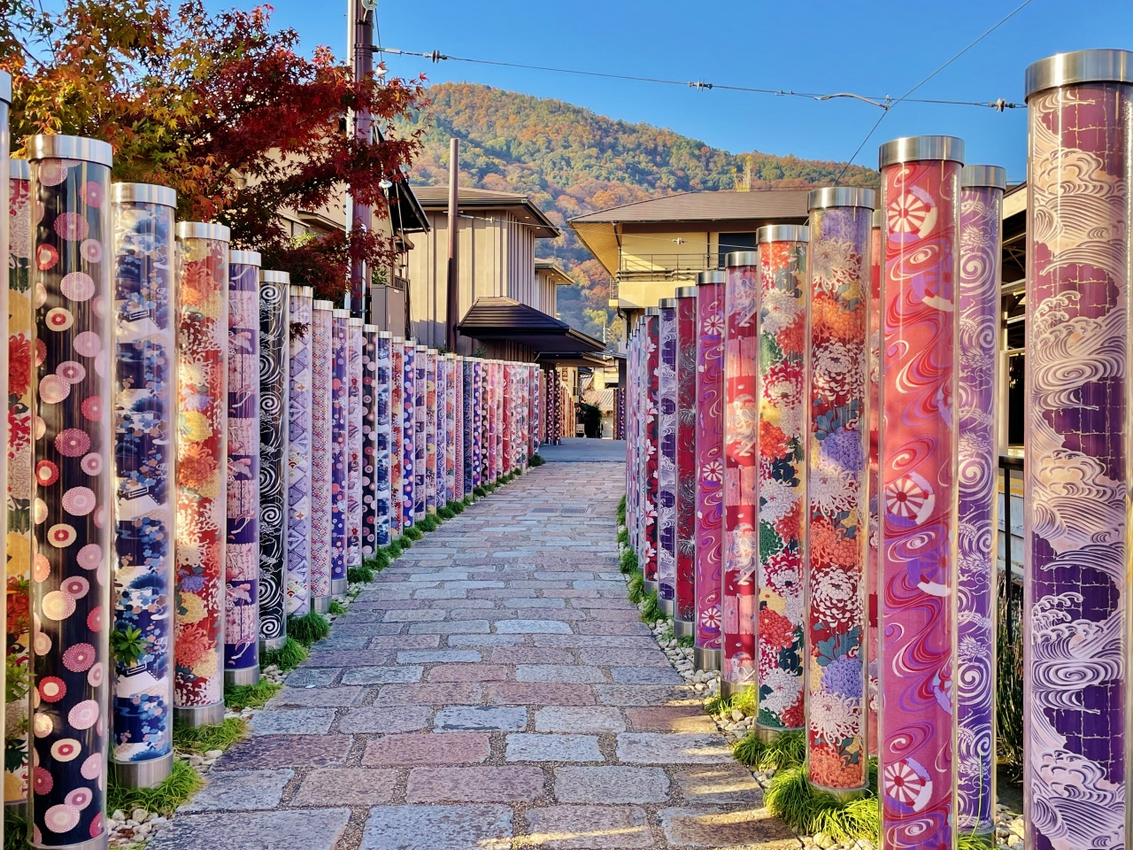 嵐電嵐山駅構内にあります。京友禅の生地を使ったポール約600本が立ち並び、和を感じる華やかな雰囲気です。朝通ったときは誰もおらずゆっくり鑑賞できましたが、昼間再び通ると、着物姿の観光客が大勢ポール前で写真を撮っているので風情もありません。今度は夜のライトアップを見てみたいです。