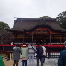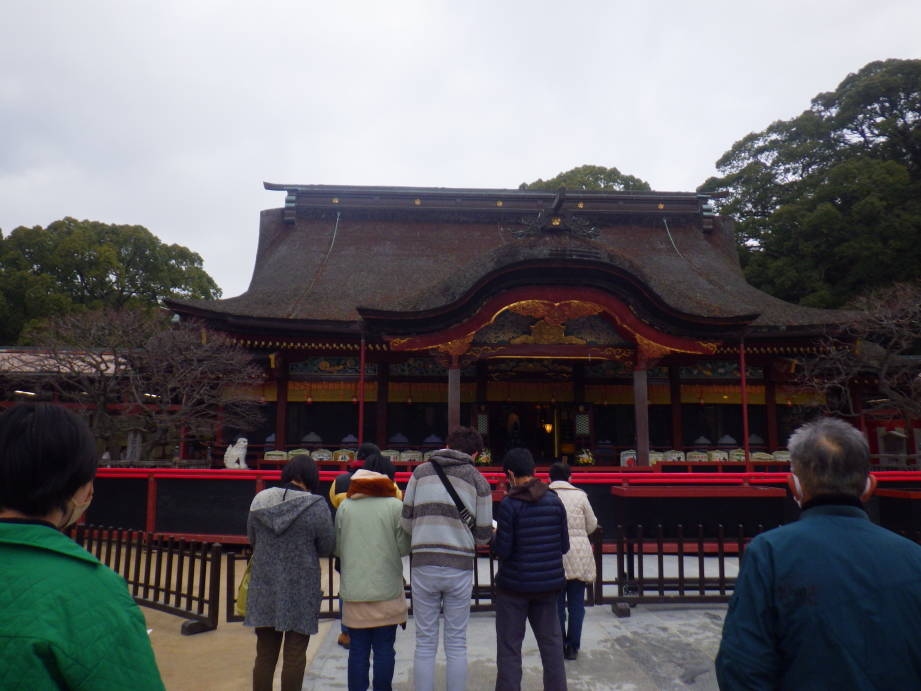 楼門をくぐると御本殿がありました。偶然、8時30分からの朝拝(朝のお祓い)の時間にあたりました。巫女さんたちに続き、参拝者へもお祓いしてくださり、大宰府の一日が始まりました。とても厳粛な雰囲気で身が引き締まりました。