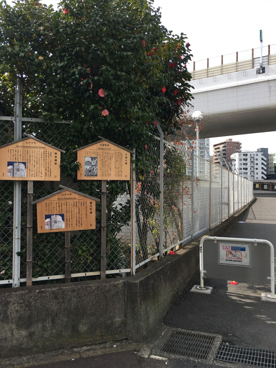 江戸時代の町名跡の看板がありました。当時の絵図が記載されていて回向院や向島に通じる要所だっだため、石の橋も架けてありました。隅田川までは徒歩1分ほどの場所にありますが面影はなく、今は住宅や道路等なっていました。