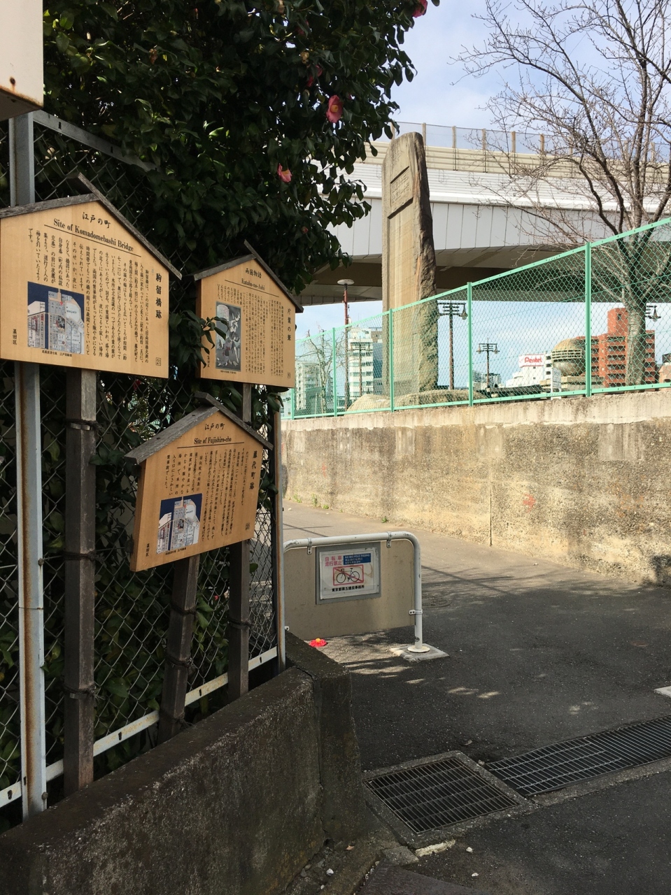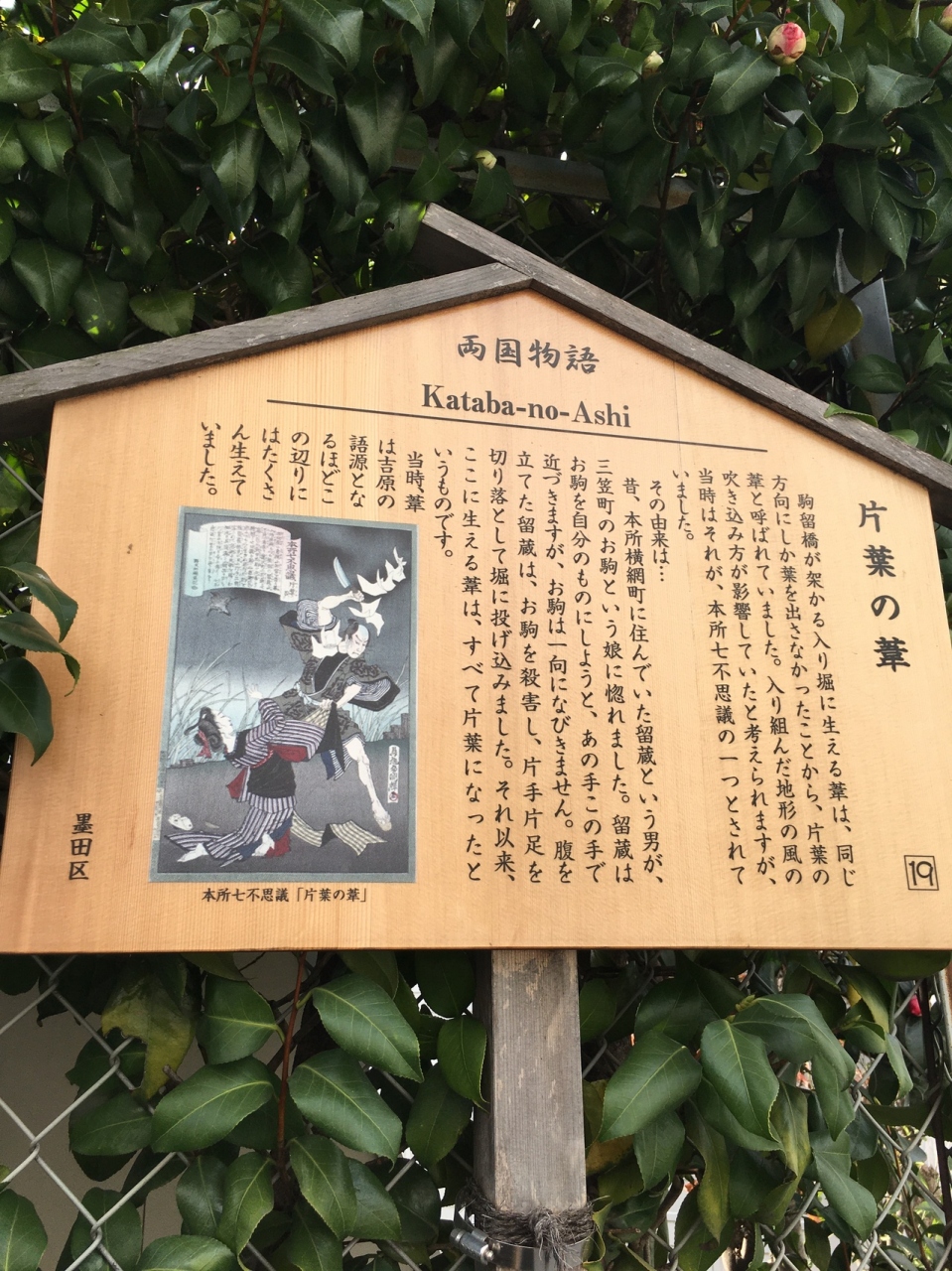 江戸時代、入り堀に生えている葦が同じ方向にしか生えなかったことからこの名称です。説明看板には他にも悲しい物語の記載がありました。現在はは民家等があり、他にも説明看板が2つありました。男女の絵も描かれていました。