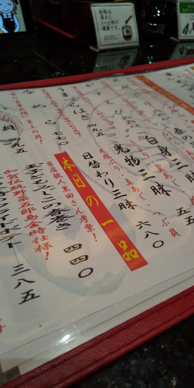イオンモール吉川美南にある寿司レストランです。回転寿司ではなくオーダーは全てタブレットを使ったタッチパネル式のハイテク寿司です。北陸の海の幸をメインに寿司や刺し身をいただけます。回転寿司よりは値段が高く家族連れならまあいいお値段はしてしまいます。セットにするとお得かも