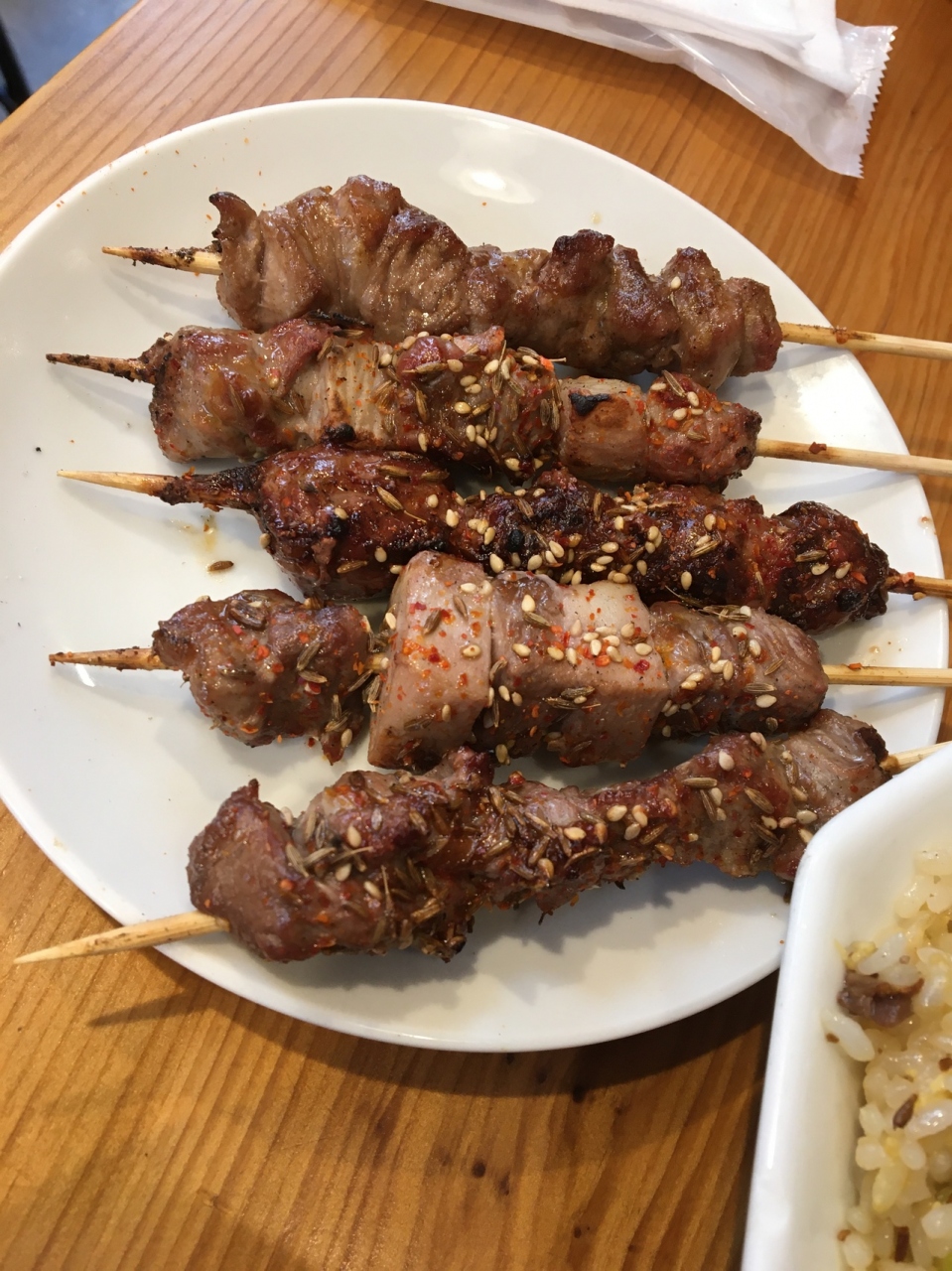 店内は狭く、テーブルも小さく、隣の席との間隔も近くて、窮屈な感じでした。ランチメニューは平日のみのようで、土曜日の昼は通常メニューでした。羊肉を期待して訪れましたが、メニューは意外と少なく感じました。串焼きは美味しかったですが、その他の料理は羊肉の良さが感じられなくて残念でした。