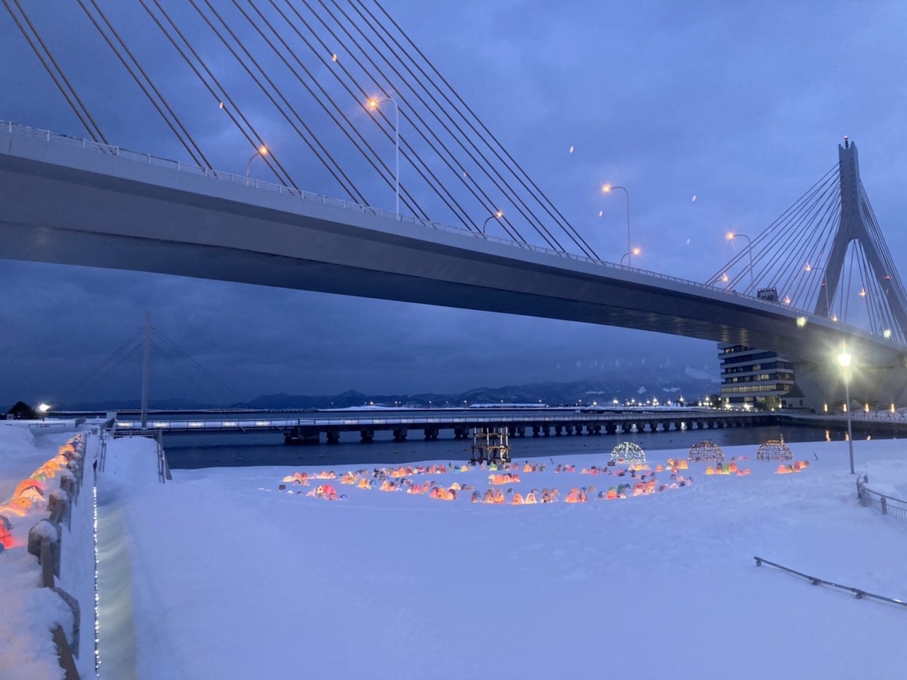 青森駅前の広場とその近くで飾られている紙でできたページェントが神秘的で美しいです。