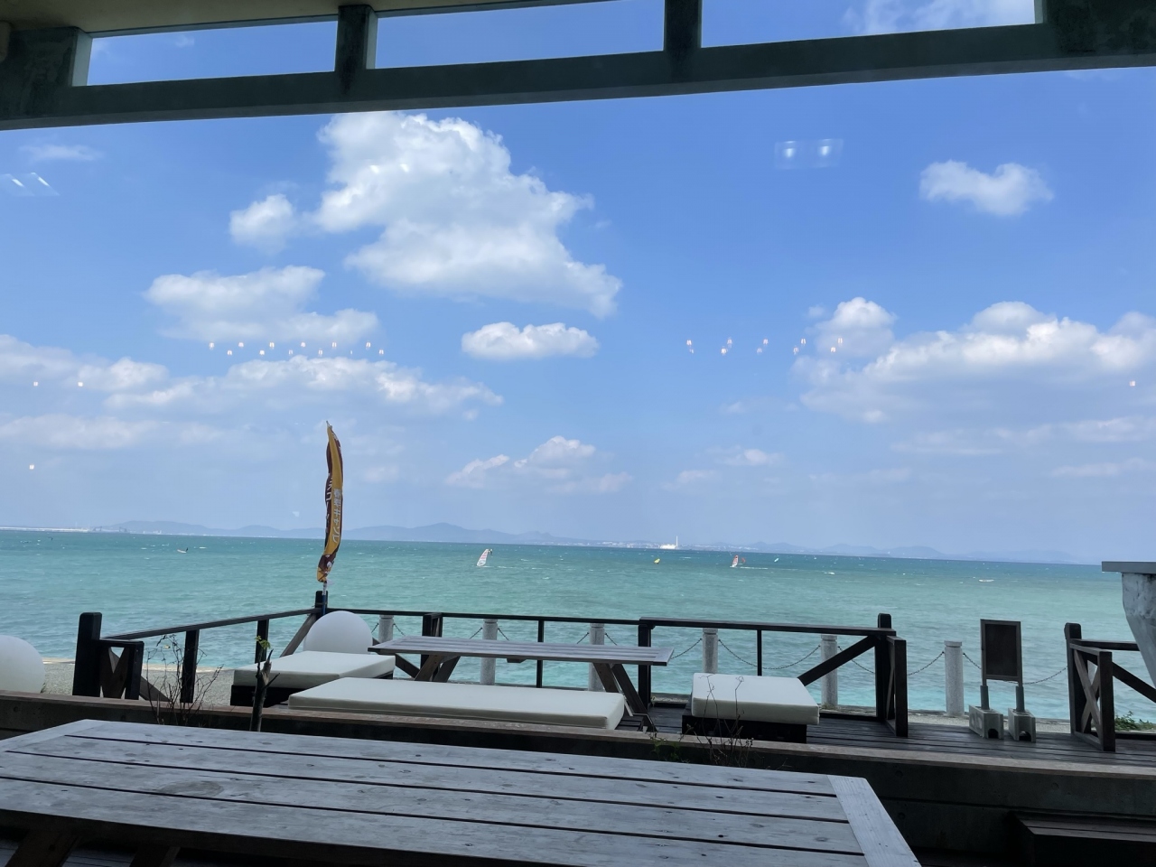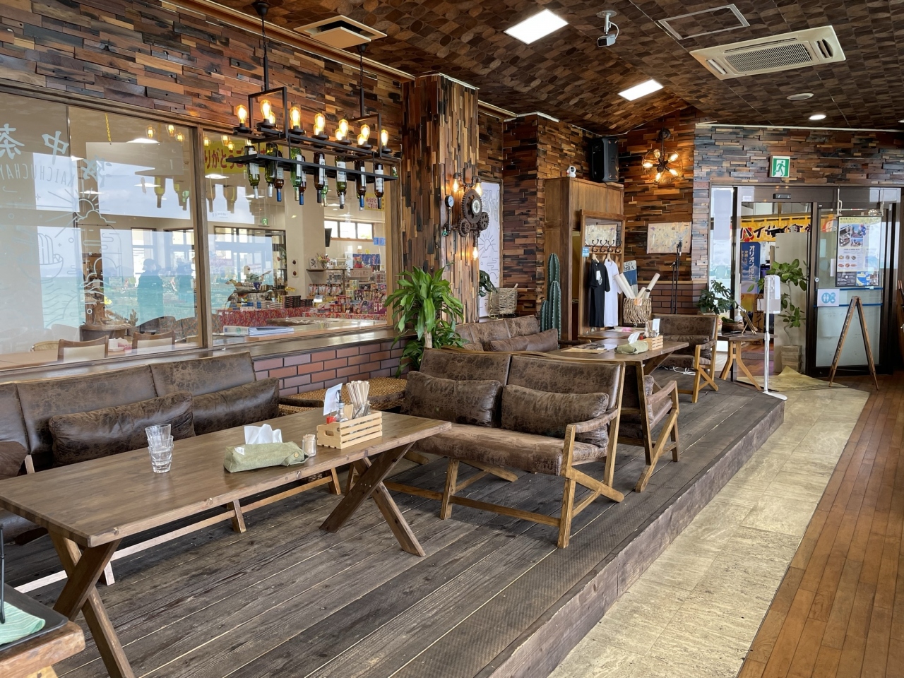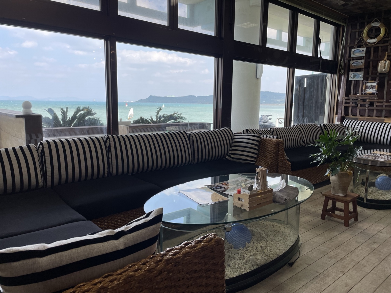 テーブル席、ソファー席もありどこに座っても海が見えます。