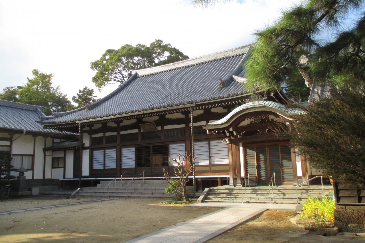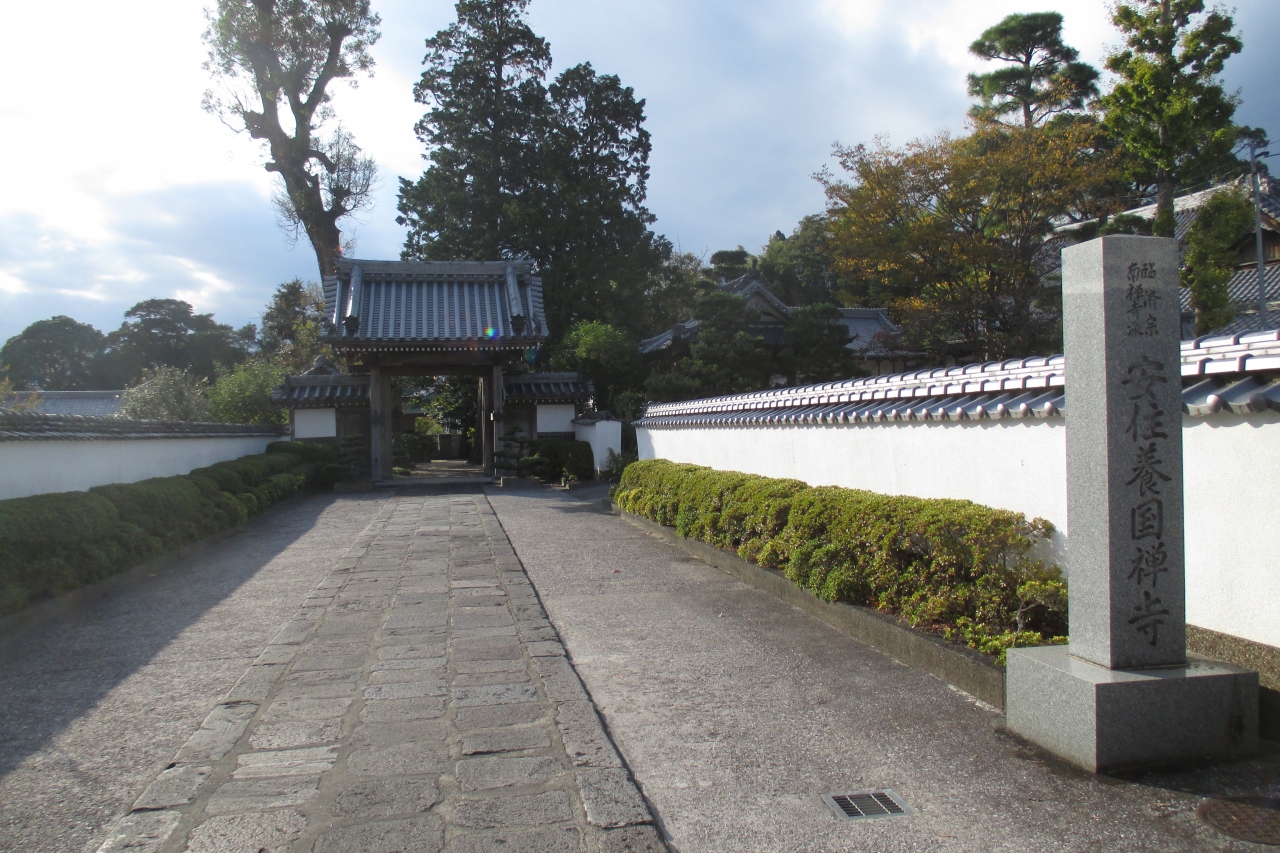 安住寺は、南台西方の寺町筋にあるお寺さんの1つで、長昌寺の北隣にあります。山門の前は左右を白壁で囲まれた長い参道です。昭和の半ばまでは松の巨木が並ぶ風情のある参道だったそうですが、松食い虫の被害で枯れてしまったそうです。山門を入った先で、右に90度向くと本堂がある、ちょっと変わった配置です。このお寺は、鎌倉時代の1259年(正元元年)に、木付初代親重によって建立されたものです。場所は南台の東南端で八坂川を見下ろす断崖の上だったそうですから、今の一松邸がある辺りでしょうか。木付氏滅亡後は衰微しますが、杵築松平藩になって、延宝年間(1673年~81年)に現在地に再興されたとのことです。なお、山号は釣鼇山(ちょうごうざん)で、臨済宗南禅寺派のお寺さんです。