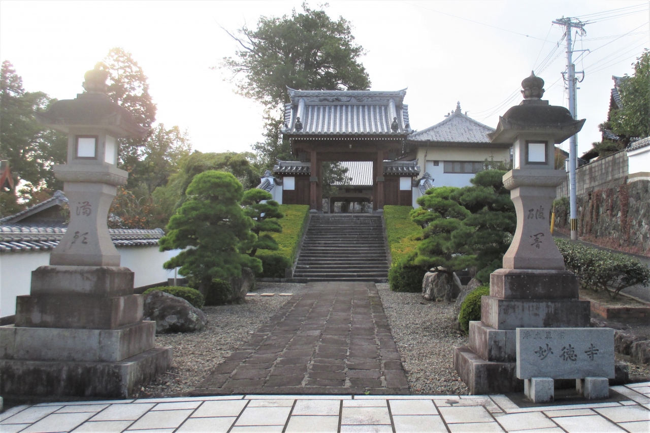 妙徳寺は、南台西方の寺町筋にあるお寺さんの1つで、5つ並ぶ真ん中にありました。山門は隣の安住寺と同じ様に奥まったところがありましたが、その入口の道路際に石灯籠があり、見掛けない文字が刻まれていました。何とか頑張って読むと、右側には「破闇」、左側には「満願」です。合わせると「破闇満願(はあんまんがん)」で、親鸞聖人が説いた阿弥陀如来の本願とのことです。こちらのお寺さんは山号は普賢山で、浄土真宗本願寺派ですから、宗祖の言葉を入口に置いたのでしょうね。