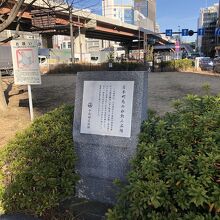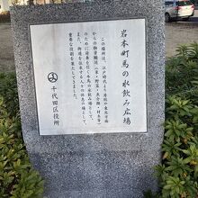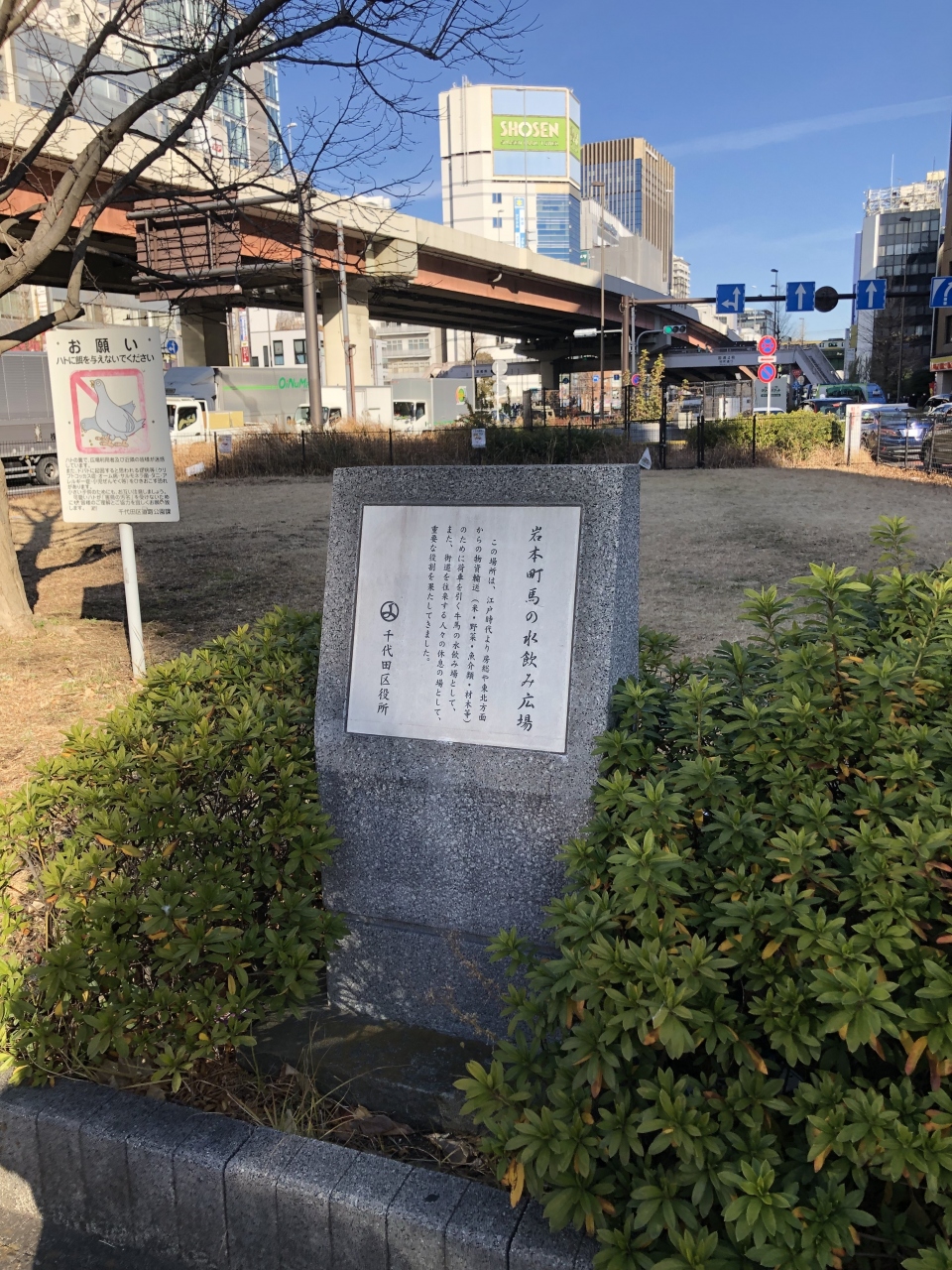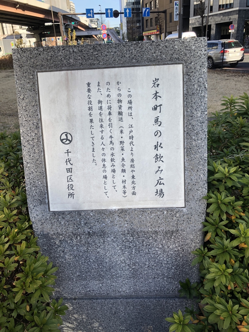 岩本町駅近くの昭和通りと靖国通りが交差する一角に碑が建てられています。説明文によると、この場所は、江戸時代より荷車を引く牛馬の水飲み場や往来する人々の休息場だったのだそうです。説明の碑があるだけで、当時の面影はありませんが、今も、車や人の往来が多い場所で、当時から交通の要所だったことが伺い知れました。