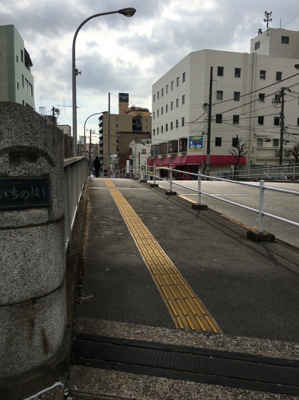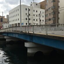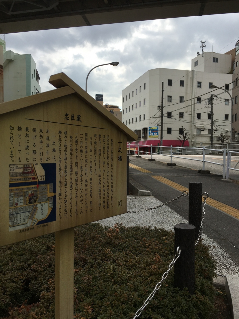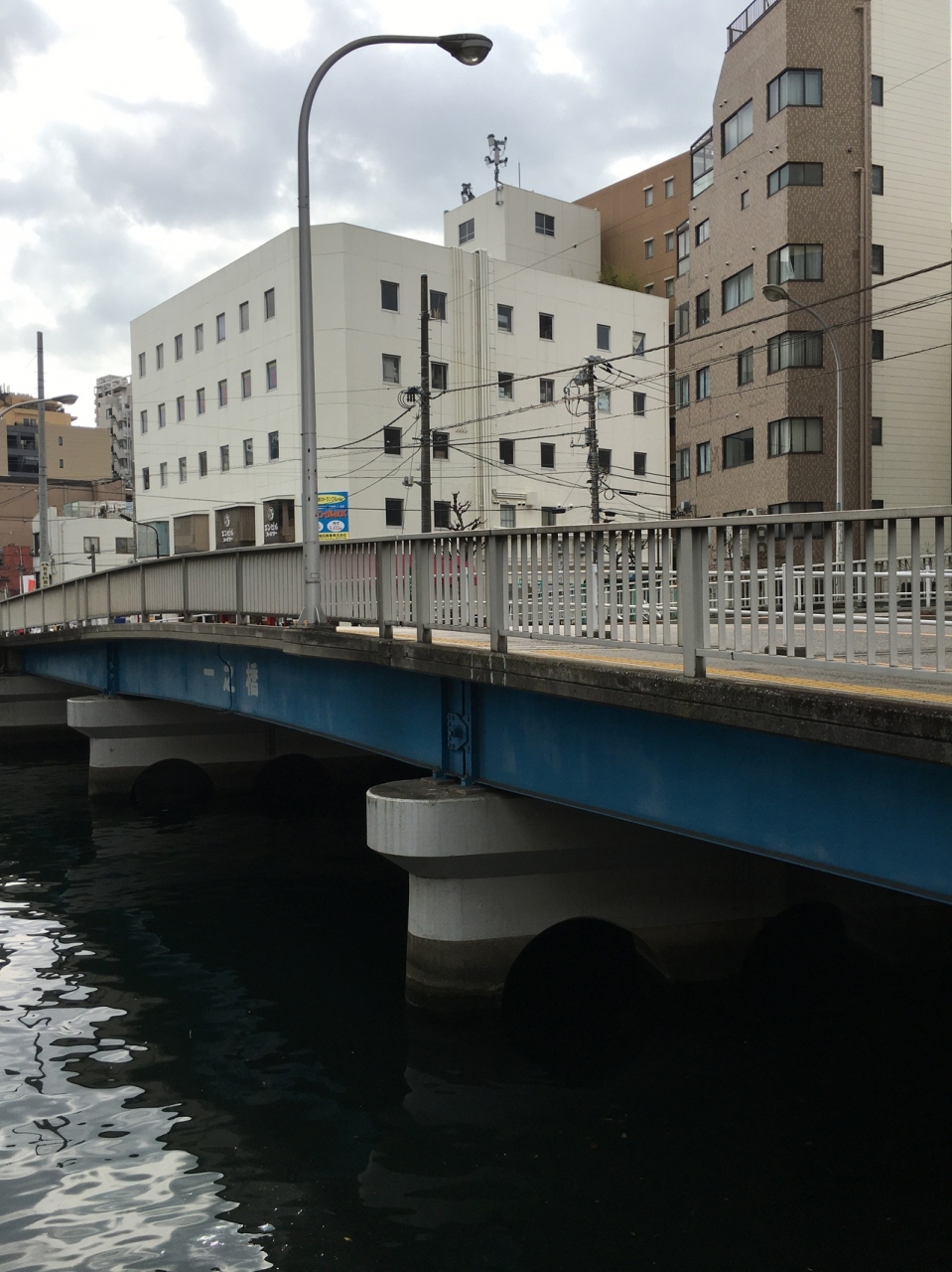 1659年隅田川から入って一番目の橋なのでこの名称です。赤穂浪士が泉岳寺に引き揚げる時に利用された歴史のある橋でもあります。側面から見ると青い橋で交通量は少なく、上は首都高速道路で川の水は濁っていました。