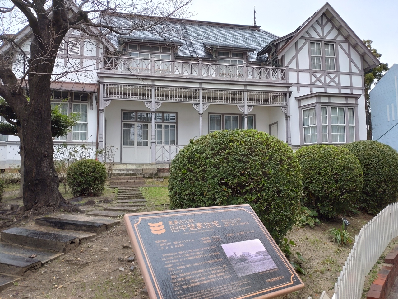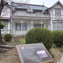 洋風の建物です飲食店やホテルが並んでいる狭めの道路沿いに建っていました。専用の駐車場はないようでした。国の重要文化財となっていますが、建物・庭も囲われていて基本的に公開はされていないので、外観を眺めるのみです。