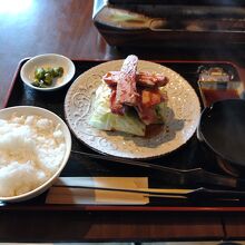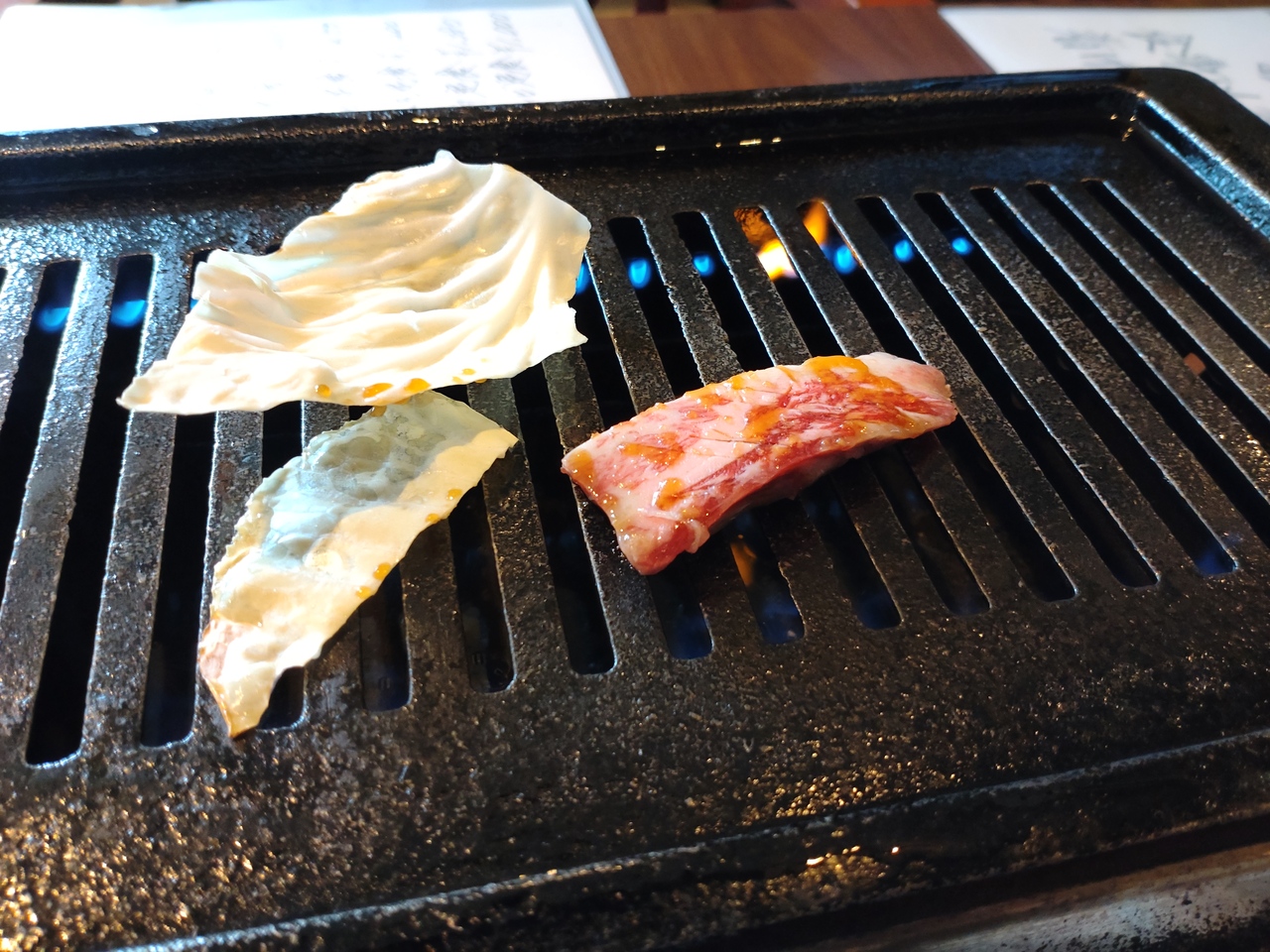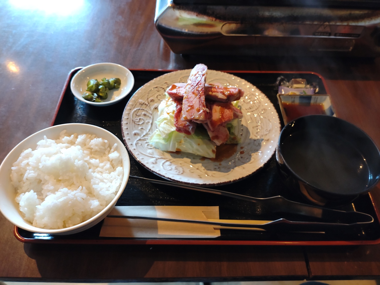 メニューは、以前は丼ものなどがあったそうですが、現在は焼肉のみ。部位を選ぶわけですが日によって異なるとのこと。訪問した日は、中落ちがあったのでこちらを選択。待つこと数分、提供されたお肉はキャベツの上にお肉がどーんとのっているシンプルな盛りつけ。しかし、これだけでもかなり期待してしまう圧倒感のあるビジュアル。お肉を一枚ずつ焼いて行くのですが、脂の落ちもちょうどよく(脂が落ちすぎて火が出たりしない)、思ったよりも厚切り。ちゃんと焼いてご飯に乗せて食べる。もちろんお肉は柔らかい。てんこ盛りのご飯(これで普通盛り)と汁物も美味。これで1200円はコスパ良すぎ。