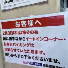 節分の2月3日は「イートインコーナー」「お寿司バイキング」は休業でした。