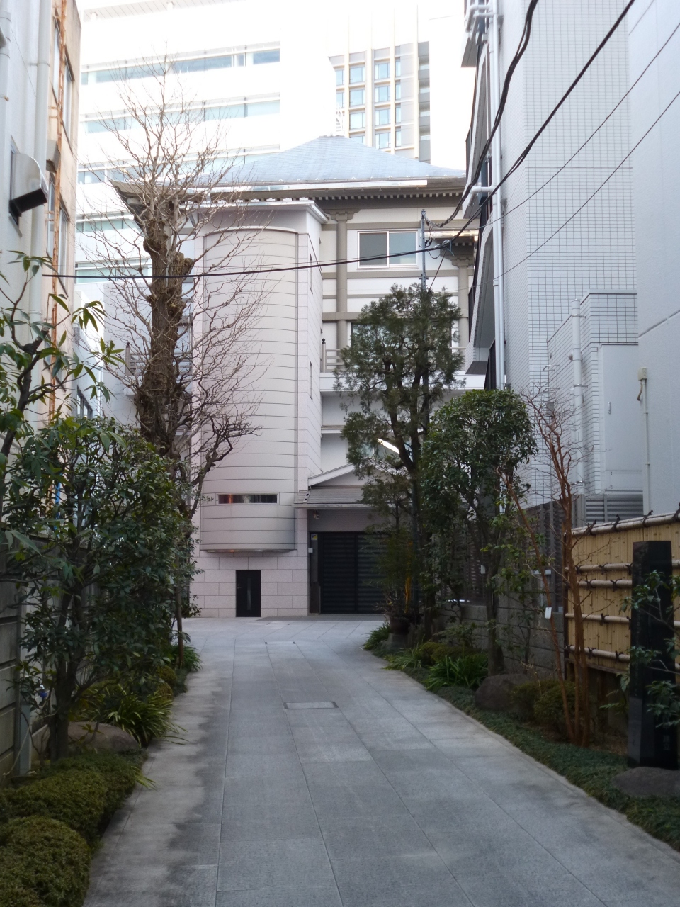 「微妙山実相寺」は、青山の裏通り沿いにある臨済宗寺院です。近隣のホテルに宿泊した際、朝食を食べに行く途中の散策で通りかかりました。スタジアム通りから分岐する熊野通り沿いにありますが、本堂は奥まっており、石畳の参道が続いています。近代的で、一見お寺とは思えないような外観が印象的でした。