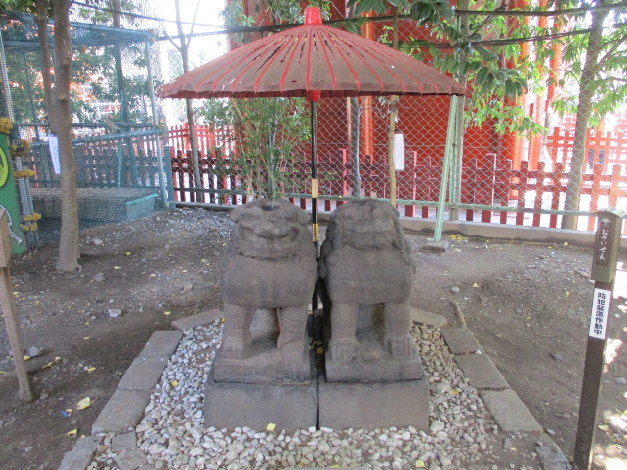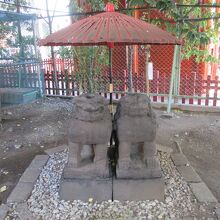 浅草寺の隣にある浅草神社。浅草寺の本尊・聖観音像を引き上げた檜前浜成・武成兄弟とその像を奉安した土師中知を祀ることから「三社さま」と呼び親しまれています。境内にたくさんの句碑などがあります。その中の一つ「夫婦狛犬」は二匹の狛犬が寄り添い、上に赤い傘が立っています。江戸初期の作で、良縁、恋愛成就、夫婦和合などのご利益があるそうです。