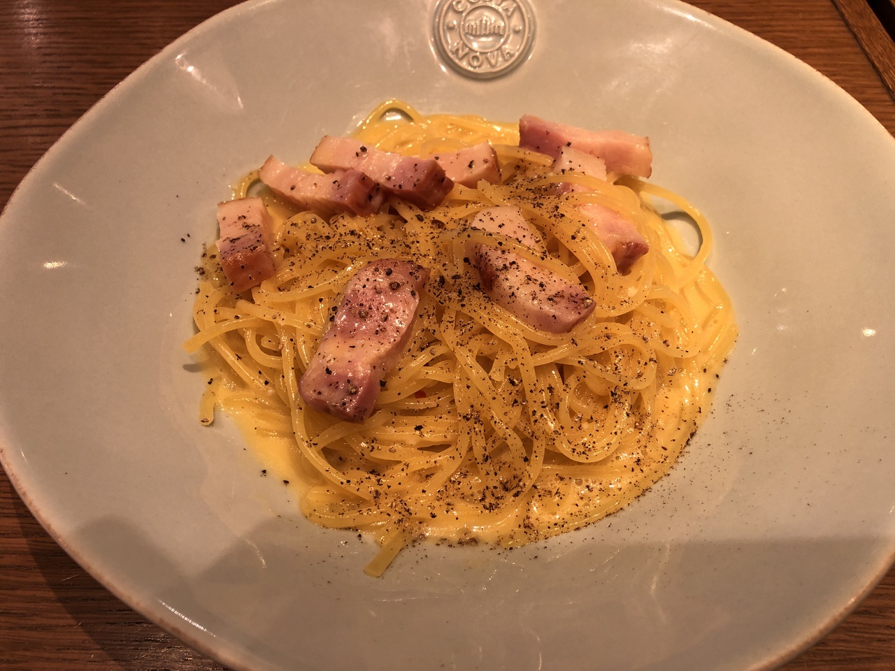昼を外れた14時ごろで天気も悪かったためか店内ガラガラでした。ローマ風カルボナーラを食べました。生クリームの入っていない本格的なチーズと卵黄だけの濃厚な本場のカルボナーラです。パンチェッタも分厚くて食べ応えあり、麺に弾力がありモチモチでした。コロナ対策かスマホからメニューを注文するシステムになっていました。