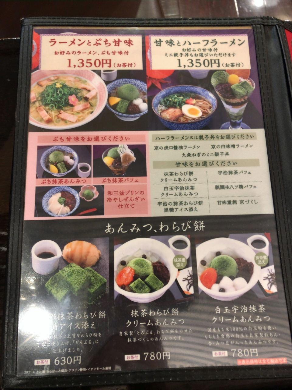 どちらも1350円の「ラーメンとぷち甘味」と「甘味とハーフラーメン」で迷い、ここは甘味処だ!と後者をチョイス。正直ラーメンは期待していませんでした。