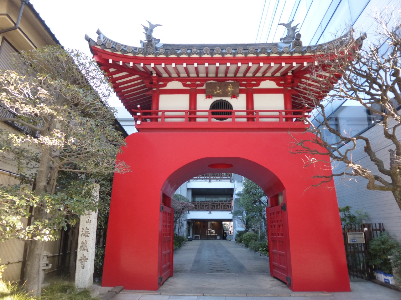 南青山三丁目交差点からキラー通りを50メートルほど千駄ヶ谷方面に向かったところにあるお寺です。小さなお寺ながらも、通りに面した赤い山門が目立ち、存在感は抜群です。本堂は奥まっており、集合住宅の一画がお寺として使われているようで、都会のお寺という印象でした。