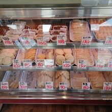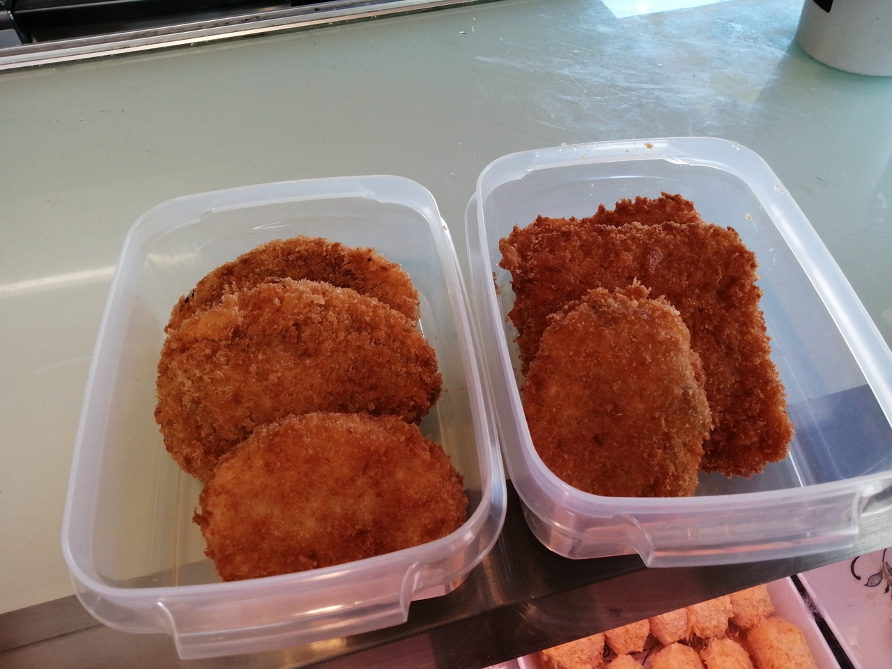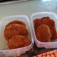 早速お目当ての揚げ物コーナーへ。おっ、ケースの中にはパン粉が付けられた状態の品々が…。注文を受けてから揚げるようです。このスタイルはありそうでなかなかありません。ハムフライ(100円)、ミンチカツ(100円)、コロッケ(70円)をすべて2個ずつ購入。値段は税抜き価格です。PayPay払いができました。
