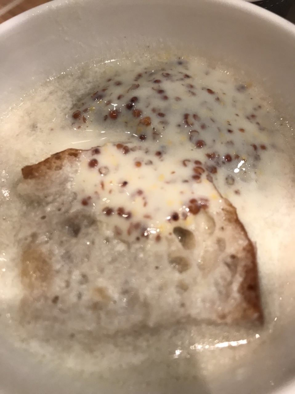 その名の通り牛乳をたっぷり使ったなめらかなスープ。一口大に切ったパンが数個入っていてスープをよく吸っている。トップには粒マスタードと思われるものがのっていて、混ぜることで若干の酸味が感じられる。スライスマッシュルームの風味が良く、スプーンで次々と口へ運んでしまう。途中出てきたくるみの歯応えはサプライズ。