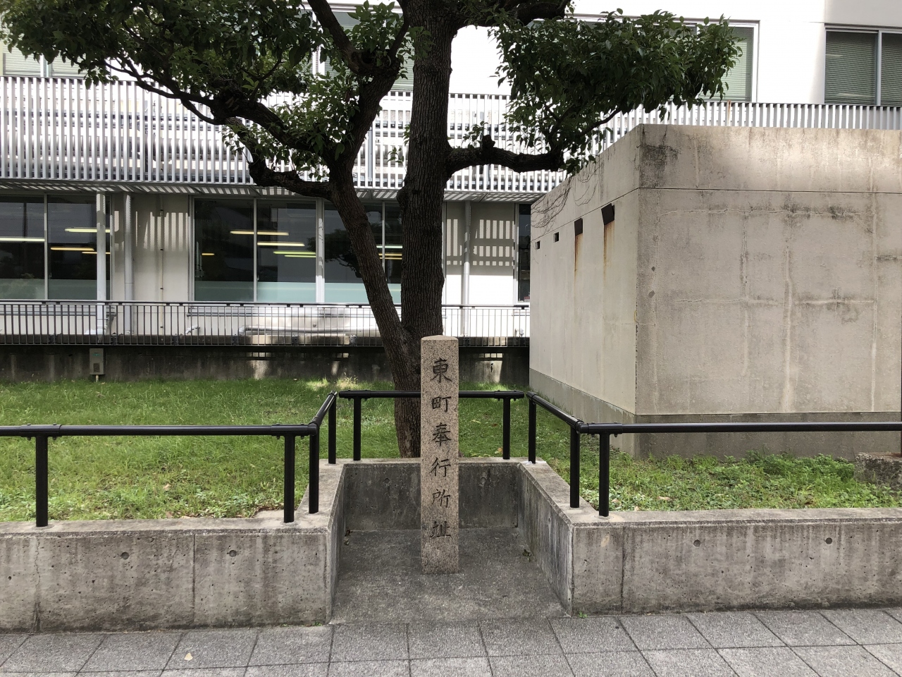 京阪天満橋駅から歩いて行きました。大阪合同庁舎第1号館前の歩道の脇に「東町奉行所跡」と書かれた石碑だけがあります。西町奉行所とともに大阪城の近くに築いた奉行所(代官所)。ちなみに、西町奉行所は3km程離れたマイドーム大阪の前の植え込みにあります。