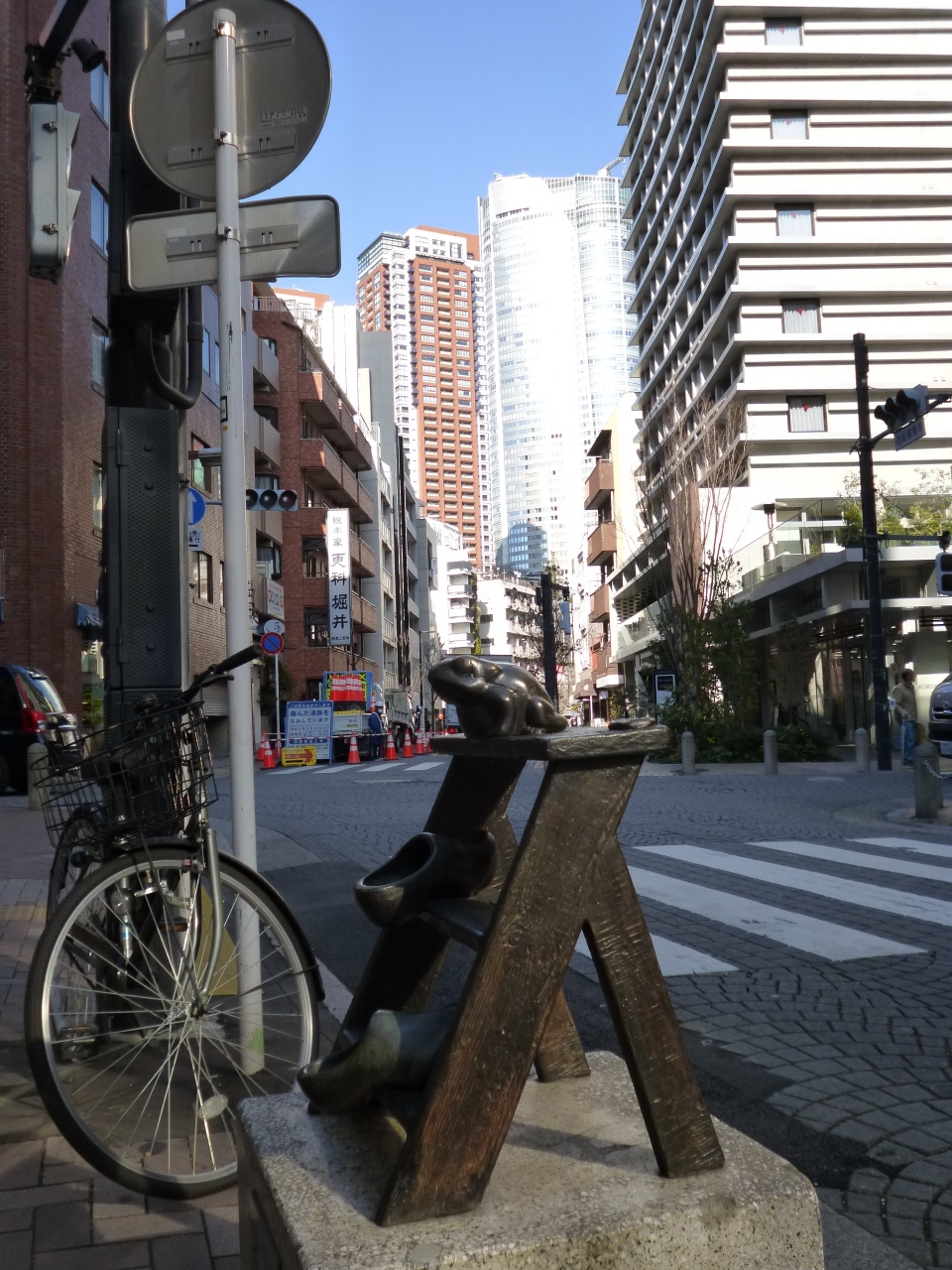 微笑みのモニュメント「はしごの上でほほえんで」は、微笑みのモニュメントの中でも西側、六本木ヒルズ側に位置します。この辺りまで来ると、視線の先には森タワーの姿が見えてきて、アーティスト作品と森タワーをコラボさせた写真を撮ることが出来ます。