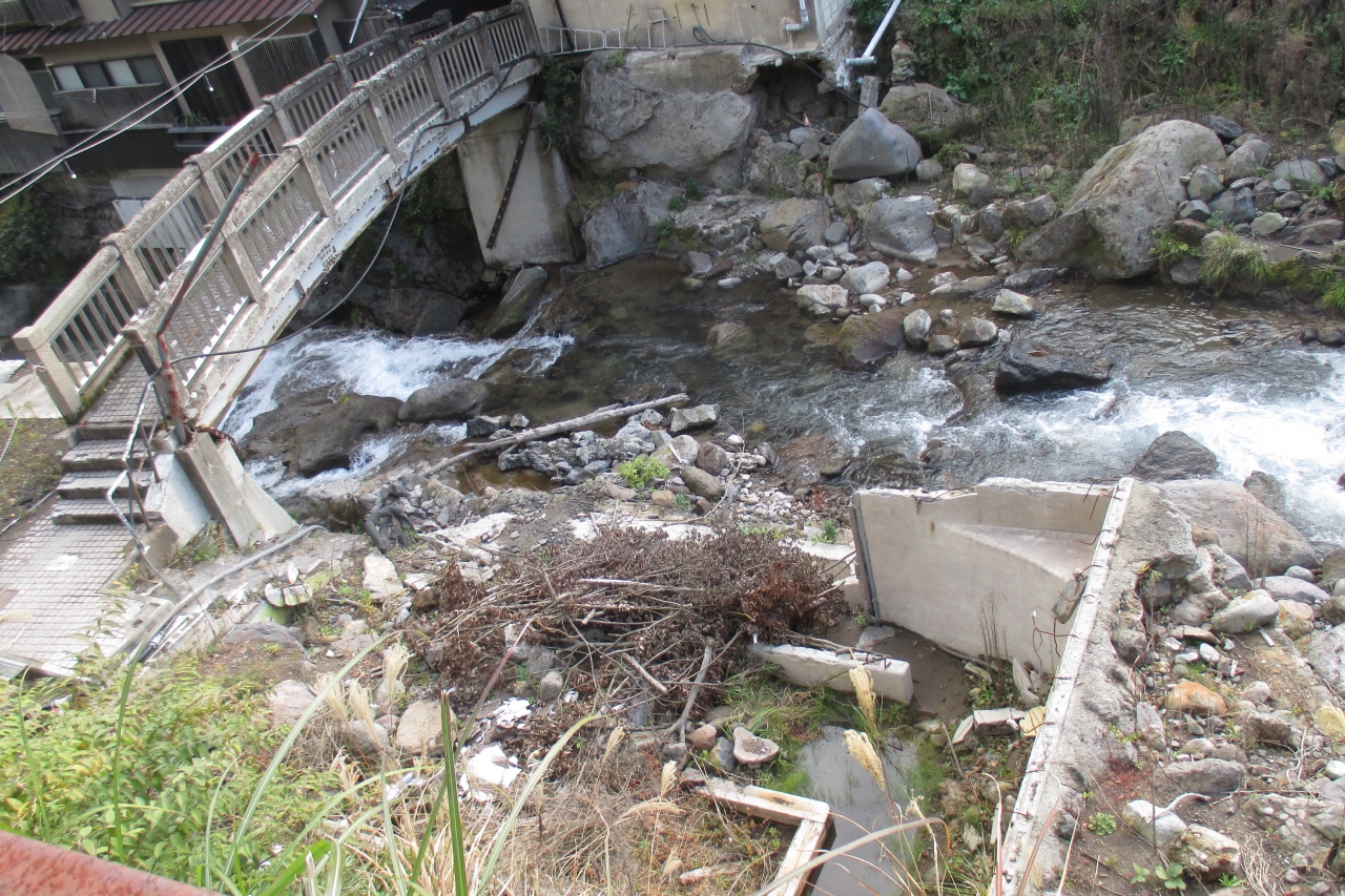石畳を上っていくと、2020年(令和2年)7月の豪雨で亡くなった女将のやっていた旅館つるや隠宅の建物がありました。その先にある白雲荘の角に砂湯の小さな案内板があります。細い路地を通り、橋を渡った先にあったはずの砂湯はありません。5つの共同浴場の真中にあるので、中央温泉とも呼ばれていたそうですが土台だけしか残っていませんでした。まさに、いまいずこ・・・です。