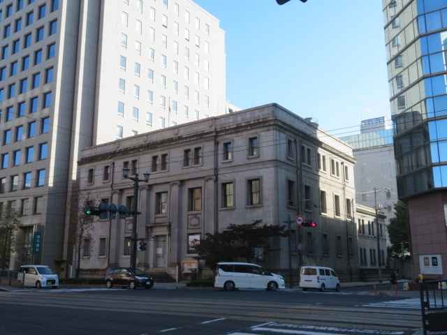 袋町駅の大通りに面しています。昭和11年竣工ということで、こちらも原爆を受けた建物です。やはり銀行建築ということで、頑丈に建てられたのでしょう。原形はとどめています。素晴らしいレトロ建築という言葉だけでは言い尽くせない歴史を背負っています。斜めから見た全景がとても華麗です