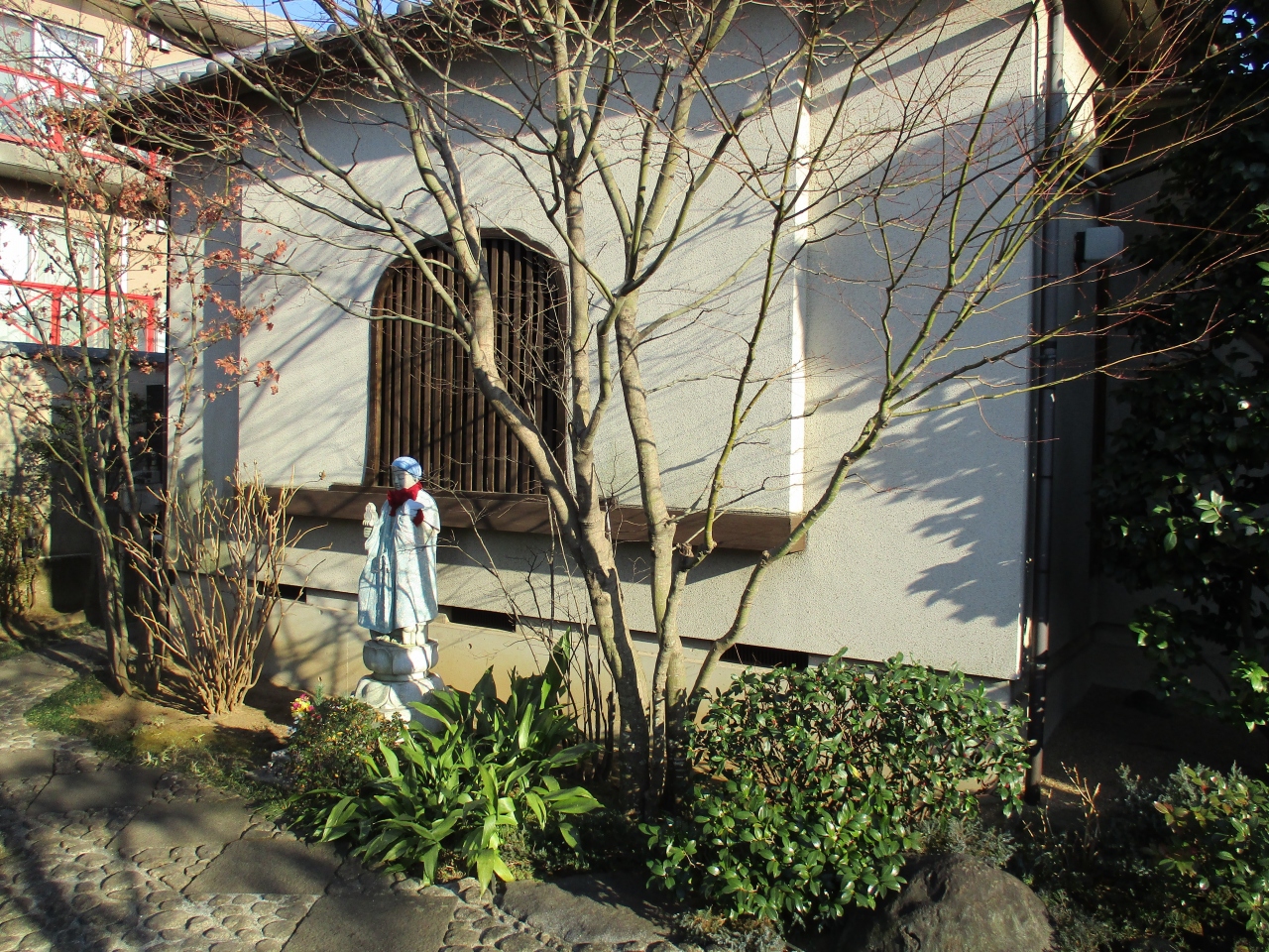 上野桜木周辺を散策していて、お寺があったので立ち寄ってみました。天台宗のお寺で上野寛永寺とも関係があるお寺のようです。境内は狭くて普通の民家のようですが、建物の脇にお祀りしている石像が、冬の時期だからか、赤いマフラーと毛糸の帽子を身に着けているので暖かそうでした。