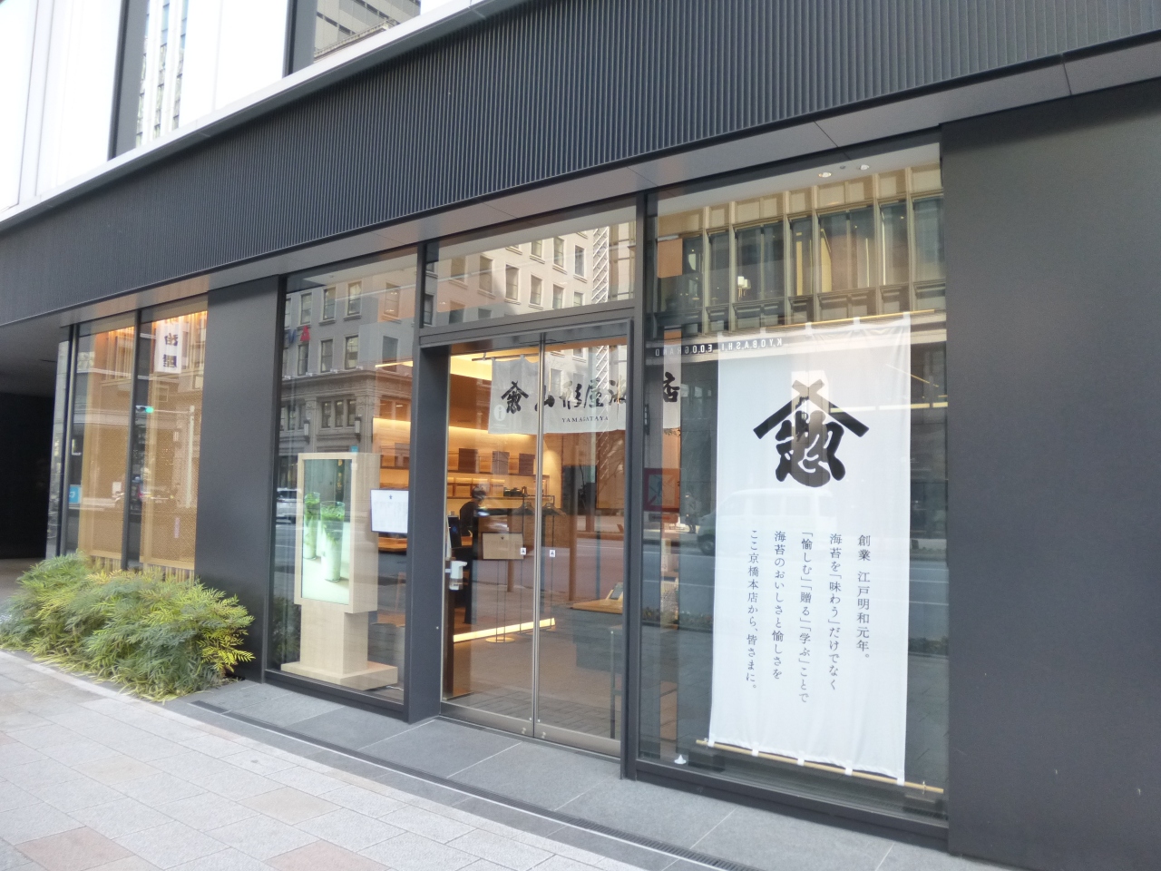 山形屋は、明和元年(1764年)創業の老舗海苔店です。その本店が、地下鉄京橋駅すぐ近く、中央通り沿いに建つビルの1階にあります。店舗とともにイートインスペースもあり、軽食から甘味、日本茶、カフェなどをいただくことが出来ます。新しいビルにリニューアルオープンしており、スタイリッシュな雰囲気に生まれ変わりました。