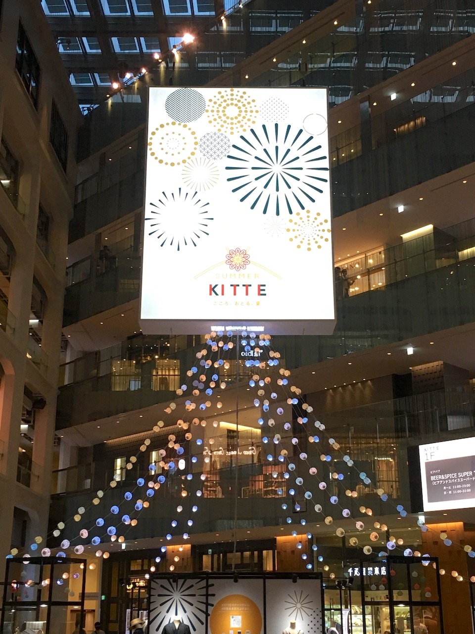 1Fアトリウムの展示と天井から吊るされたバナーに、花火のイラストが描かれていました。