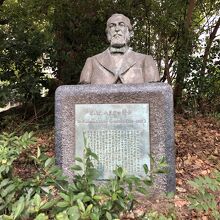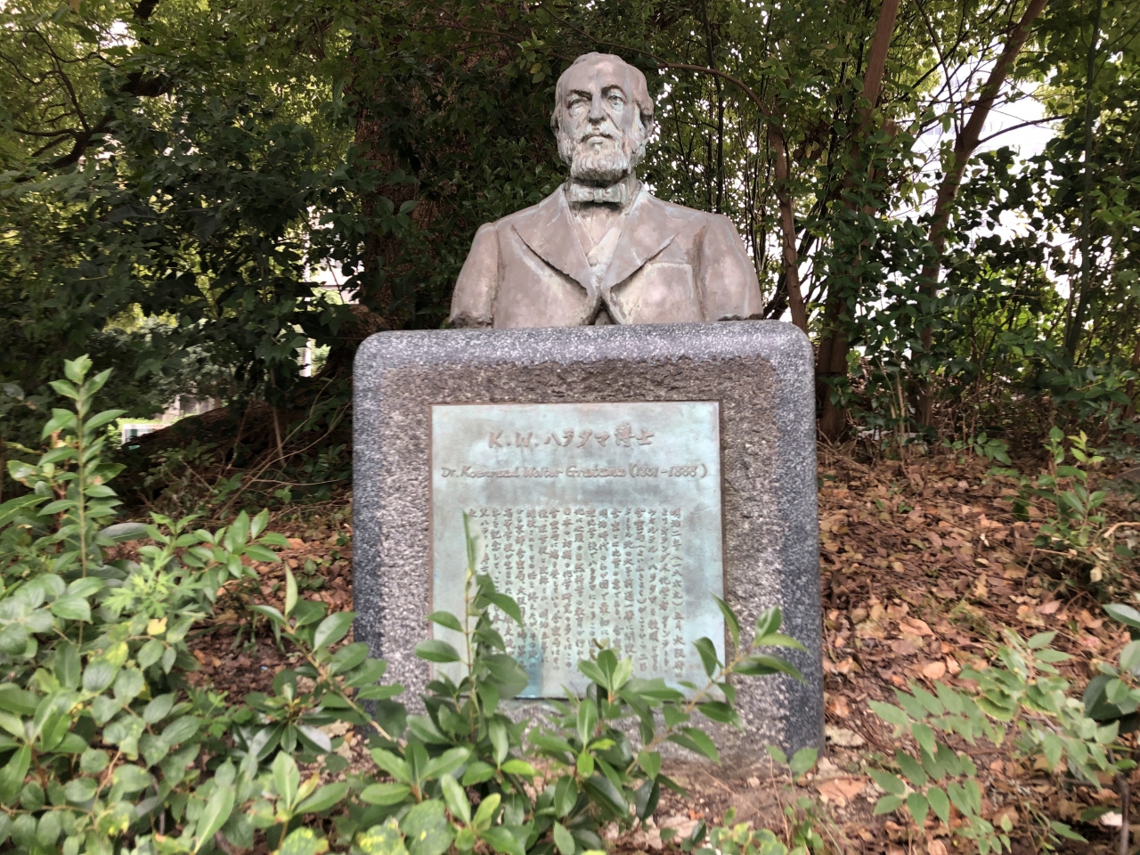 「舎密局跡」の碑がある植え込みの一角に「K.Wハラタマ博士顕彰碑」もあります。明治2年(1869年)5月、この場所で日本で最初の理化学学校「舎密局」が政府により開設されました。ハラタマ博士は初代教頭に就任したオランダ人の科学者です。この木々が生い茂った植え込みの中には、「大阪衛生試験所発祥の地」の石碑もありました。