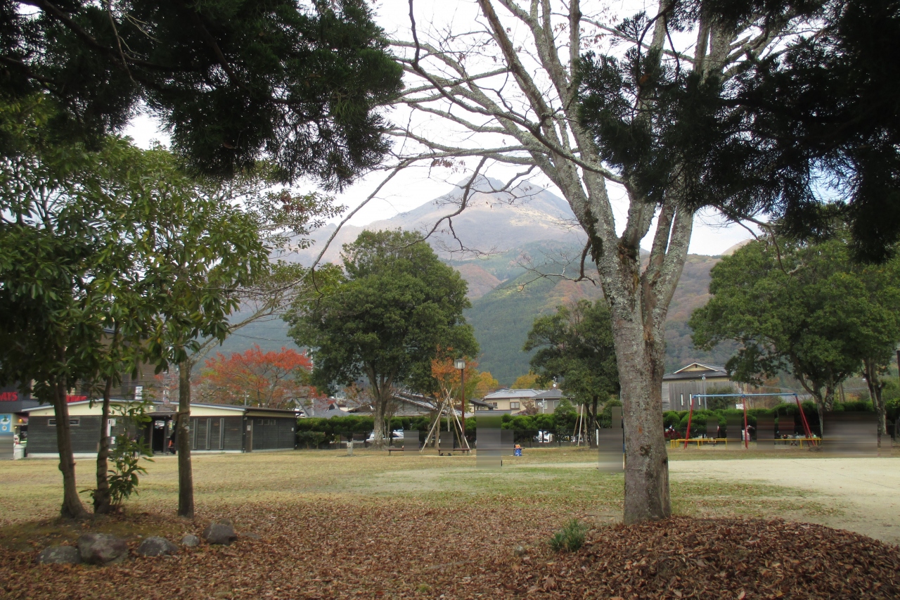 いろいろな観光向けショップの並ぶ湯の坪街道に、お母さん達がお子さん達を遊具で遊ばせている異種の空間があるのが不思議な感じがしました。生活をするには必須の場所であることを感じました。湯の坪街道側からみると、公園の奥にあるCOMICO ART MUSEUM YUFUINの奈良美智さんの犬の巨大オブジェが公園のオブジェの様にみえるところが良いですね。