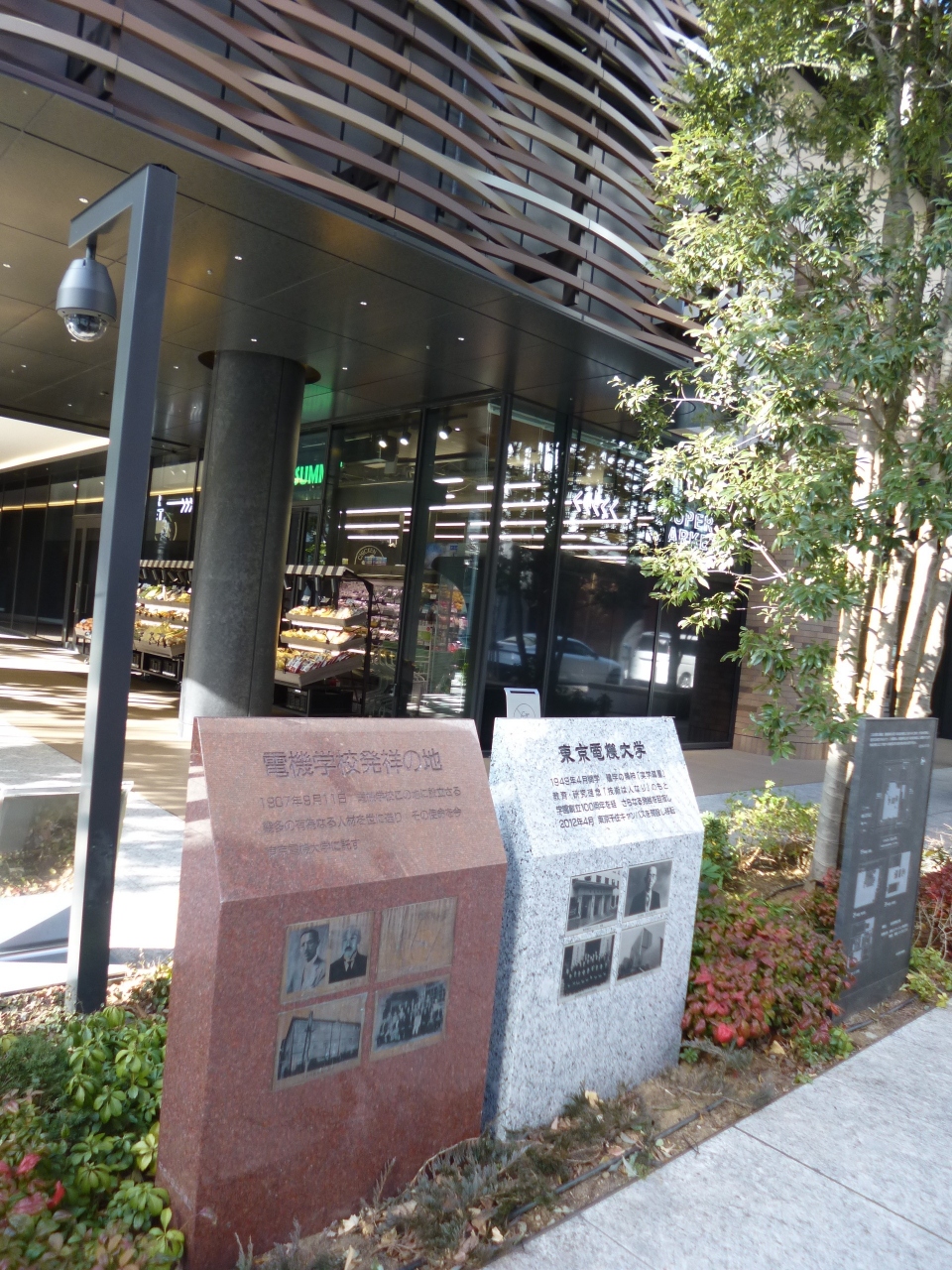 小川町の交差点から南西方向に徒歩2分ほど、新しい複合施設「KANDA SQUARE」の敷地内に「電機学校発祥の地(東京電機大学)」と記された石碑があります。かつてこの地は、東京電機大学の神田キャンパスがあった場所ということです。石碑は新しく、写真入りで見栄えのするものでした。