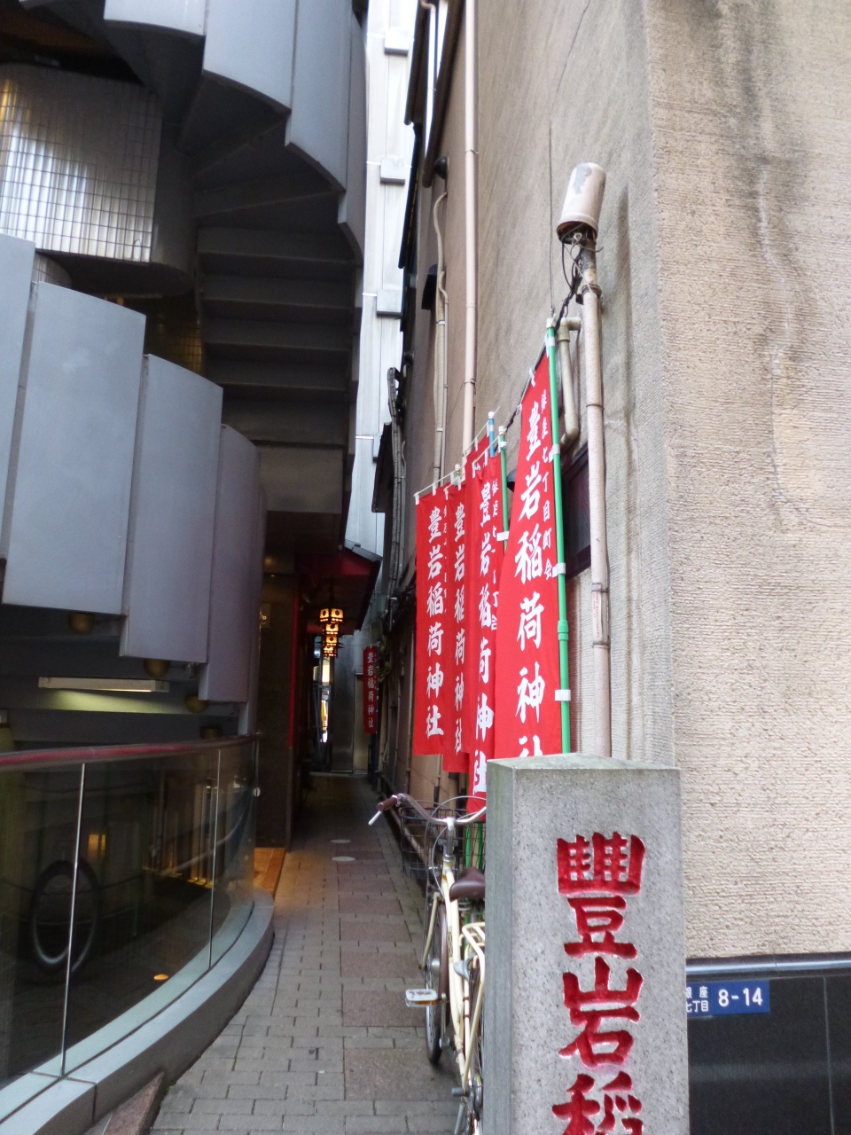 銀座7丁目、銀座すずらん通りと中央通りの結ぶ路地内に社があります。創祀は不明だそうですが、縁結びのご利益があるといわれているそうです。すずらん通りから、豊岩稲荷と書かれた石柱を目印に少し薄暗い細い路地に入っていくと、左手にお稲荷さんが。そこだけほわっとした光があり、雰囲気のある光景です。手を合わせて、中央通り側に出ると、大通りに多くの人と、車が。面白い体験のできる場所です。