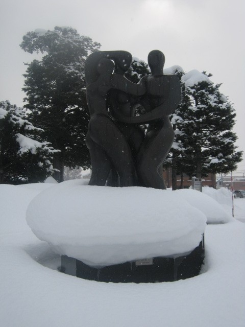 大雪アリーナ前にあるこちらの作品ですが、北海道だと屋外彫刻に関しては、冬季に養生されたりする場合も多いので、2月の中頃ここはどうか様子を観に行ってみました。