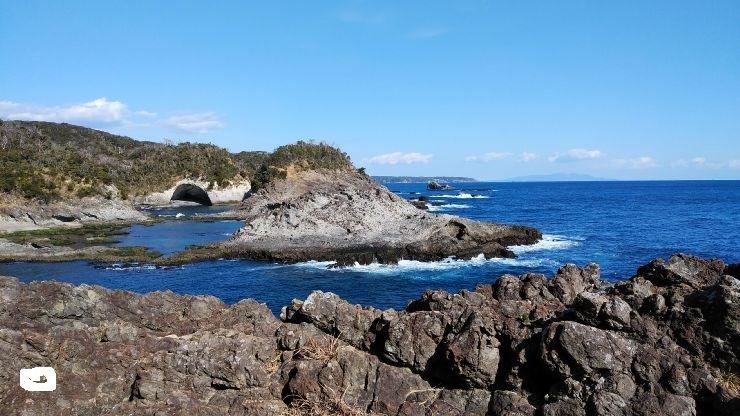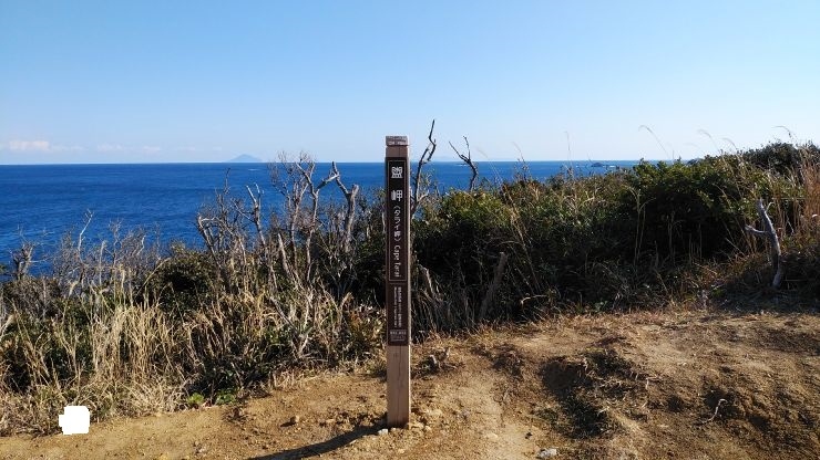 逢ヶ浜の登山道入り口からタライ岬までは10分くらいでたどり着けた。普通の山道で海岸の風景は岬の直前まで木々に覆われ見ることはできなかった。先端の岬からは周辺の海岸線のほか、伊豆七島や神子元島などの風景が見られて絶景。散策する人も少なく、風景を独占できた。